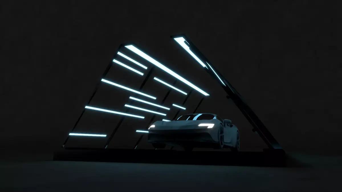 This 3D scene features a futuristic car showcase setup designed with a sleek, modern tunnel of dynamic LED light bars. The composition emphasizes symmetry, minimalism, and high-contrast illumination, making it ideal for automotive visualization, sci-fi environments, or concept art renders.