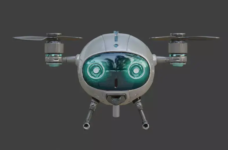 This premium 3D model features a high-quality futuristic surveillance drone designed with a friendly, animated movie style. The aircraft is characterized by its smooth, compact rounded body and a minimalist no-face aesthetic, emphasizing a modern robotic design with a personable silhouette.