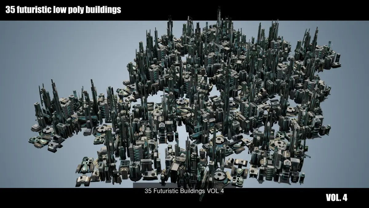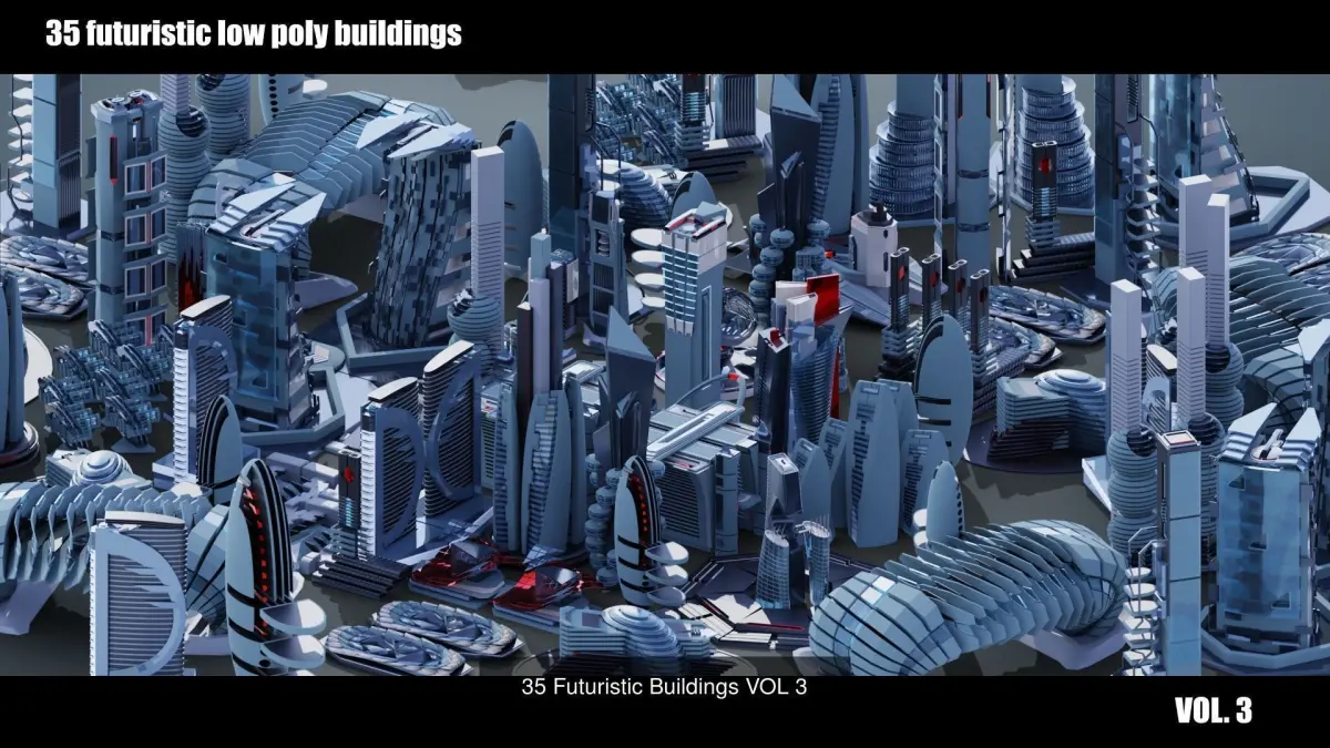 Future City Concept. 70 LowPoly and stylized buildings and skyscrapers. All models with a median point at the base center.