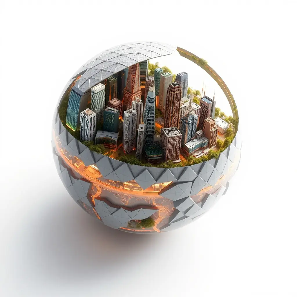 Explore a unique blend of architecture and design with the 'Futuristic City in Sphere Model Pack'. This model features an intricately detailed city enclosed within a sphere, showcasing skyscrapers and modern buildings.