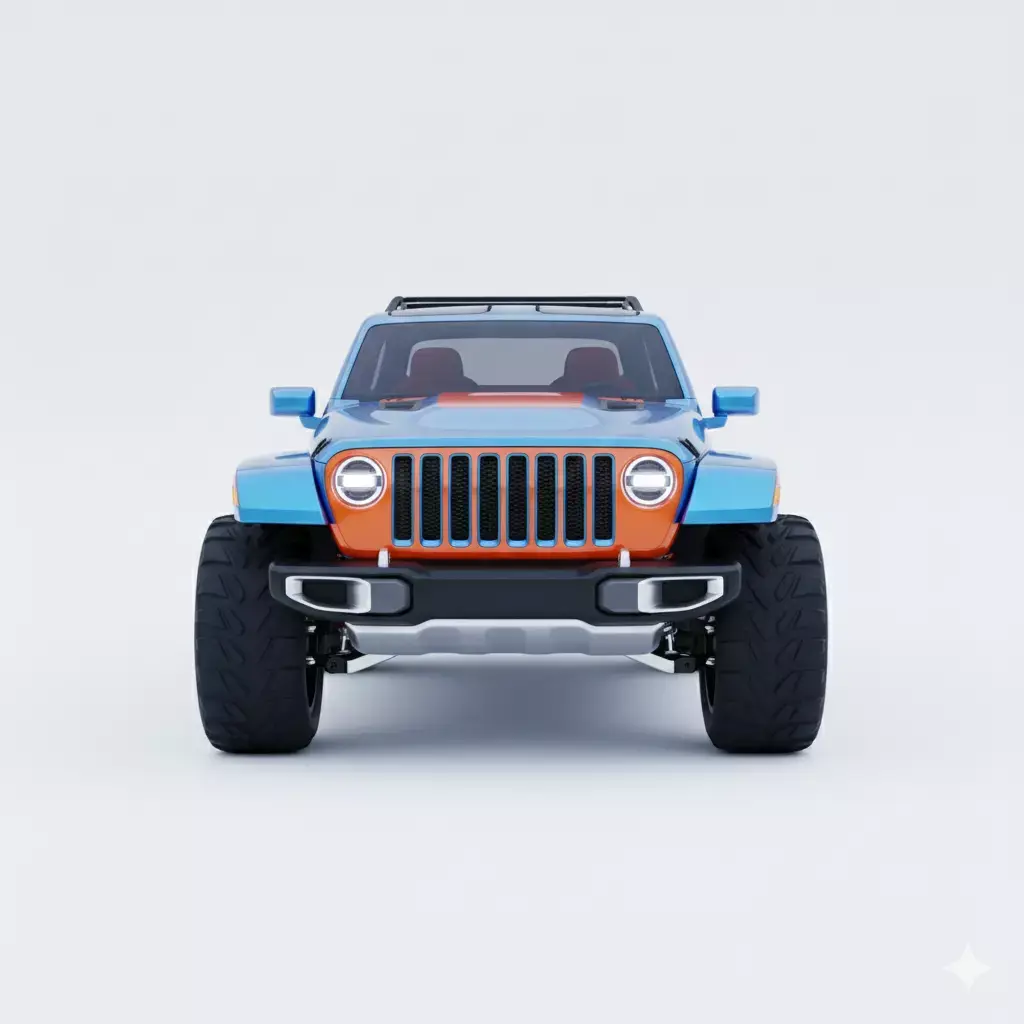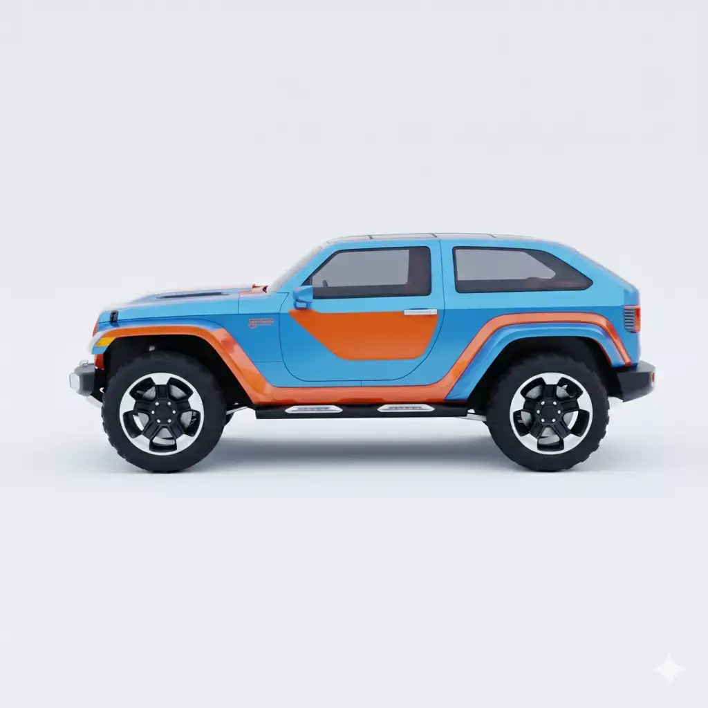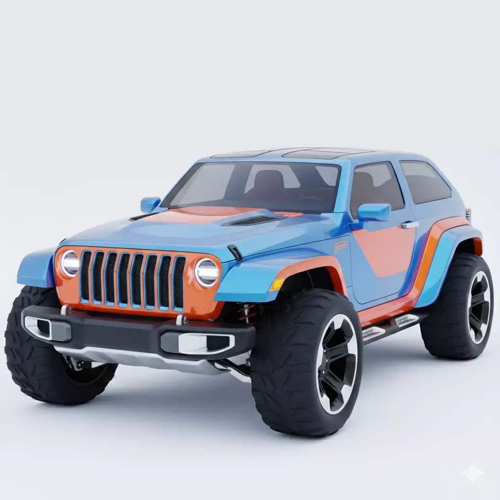 This 3D model depicts a stylized, high-performance off-road SUV designed for rugged terrain and modern aesthetics. The vehicle features a striking dual-tone color scheme, combining a metallic sky blue body with bold orange accents on the grille, hood, and side panels. Engineered for adventure, it is equipped with oversized all-terrain tires, high-clearance wheel arches, and a robust front bumper with integrated skid plates. The clean, two-door compact body style suggests a nimble yet powerful 4x4 concept, perfect for automotive visualization, gaming environments, or conceptual transport design.