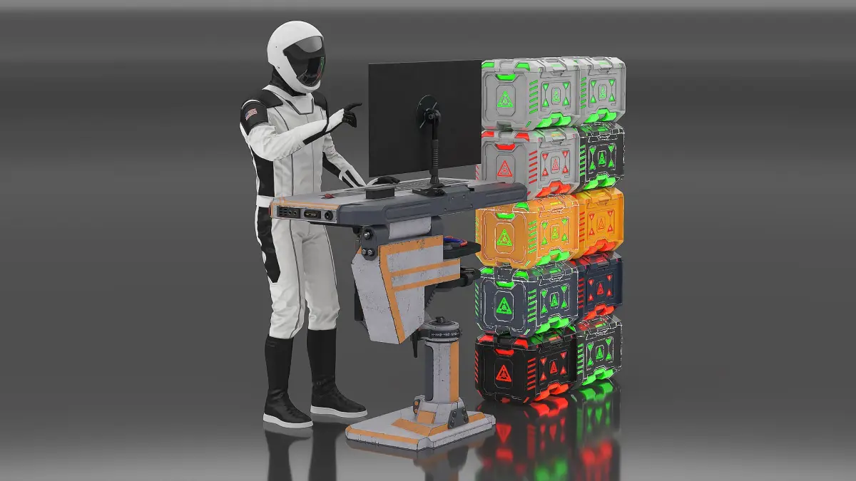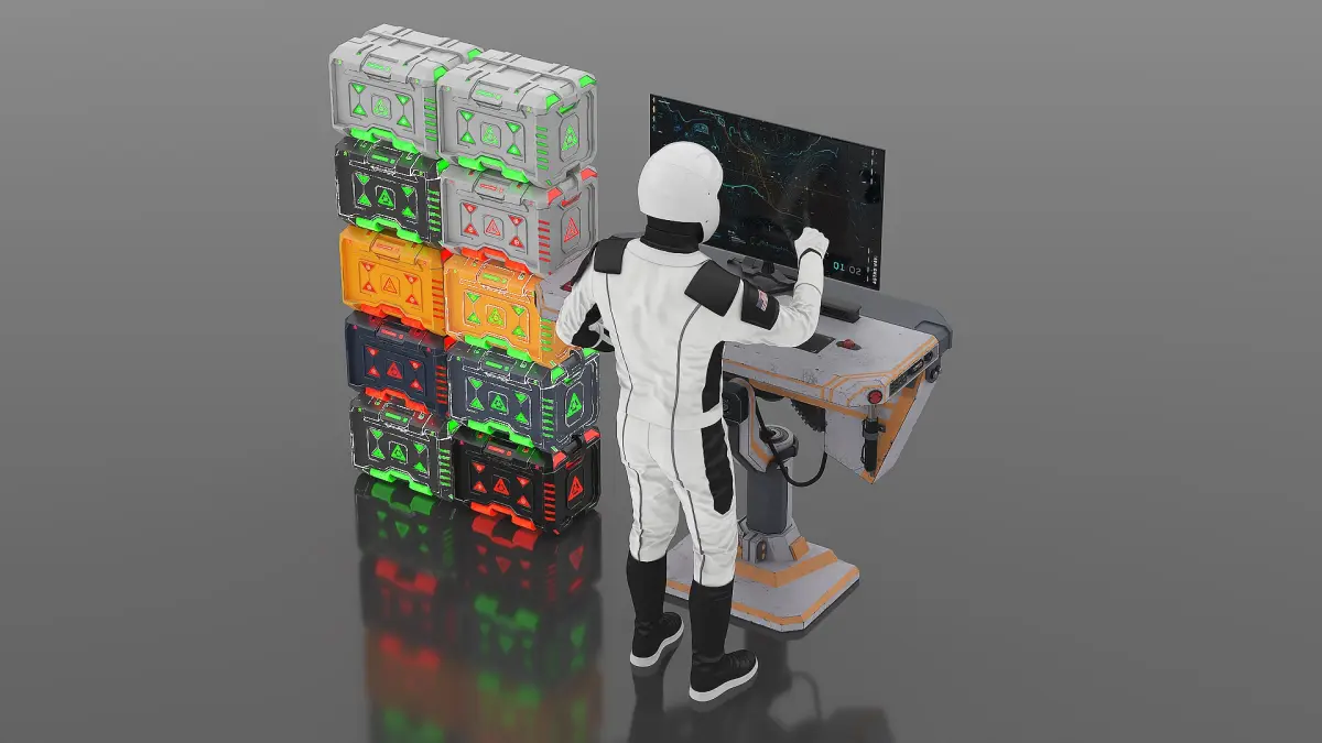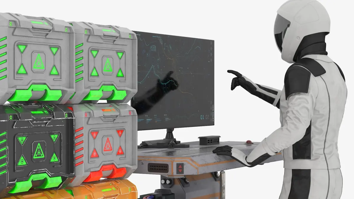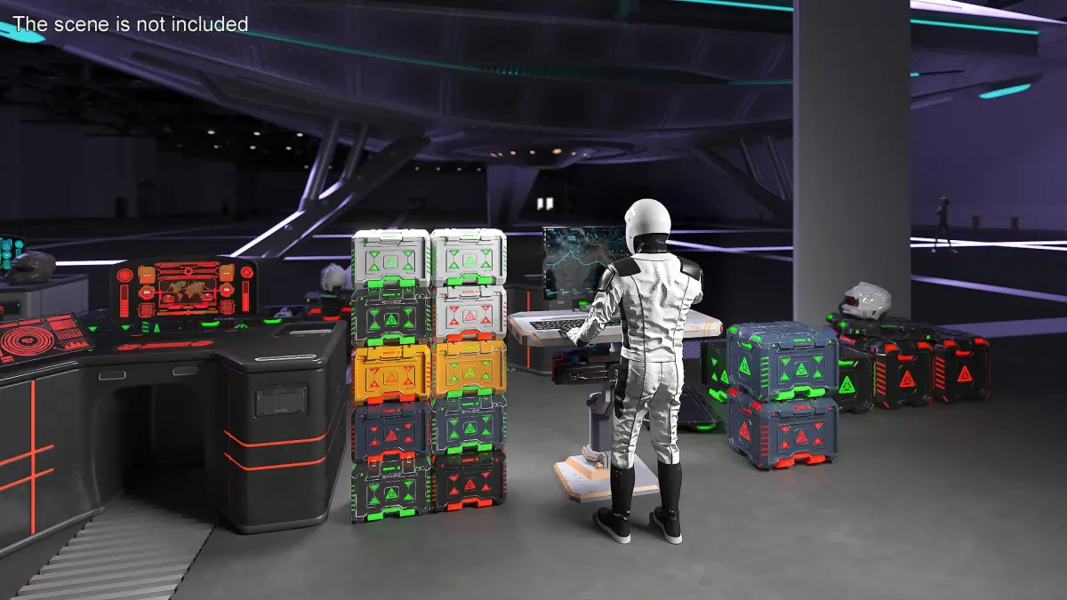 Futuristic Control Station with Astronaut and Sci-Fi Crates is a three-dimensional model of futuristic design props, which are science fiction-style setup crafted for imaginative and high-tech scenarios.