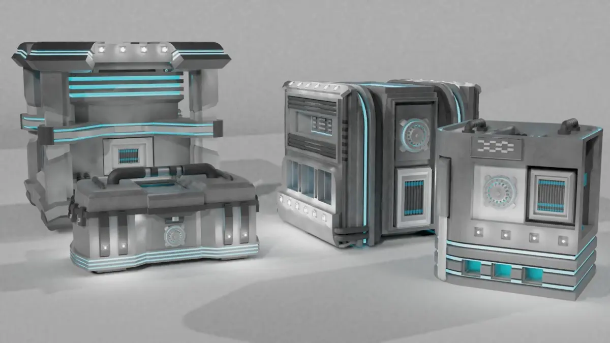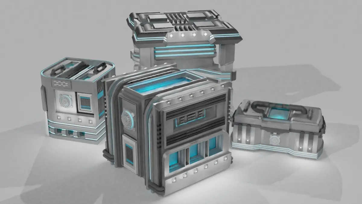 This set of futuristic crates contains a wide variety of crates in multiple shapes and appearances. The crates are multiple sizes, can be used in various environments like game design or concept art, and go together in a futuristic technology theme.