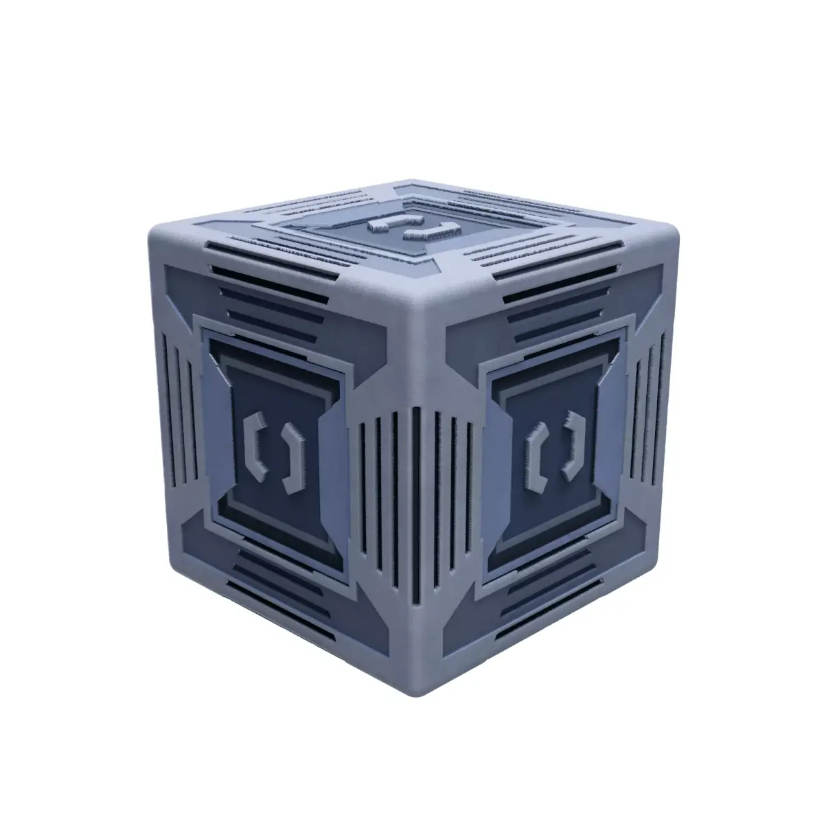 Add a touch of futuristic detail to your sci-fi scenes with this meticulously crafted 3D model. This model features a high-tech design with intricate paneling, detailed grilles, and a stylized symbol on each face, making it perfect for use as a mysterious energy source, a storage container (crate), or a puzzle element in your games and animations.