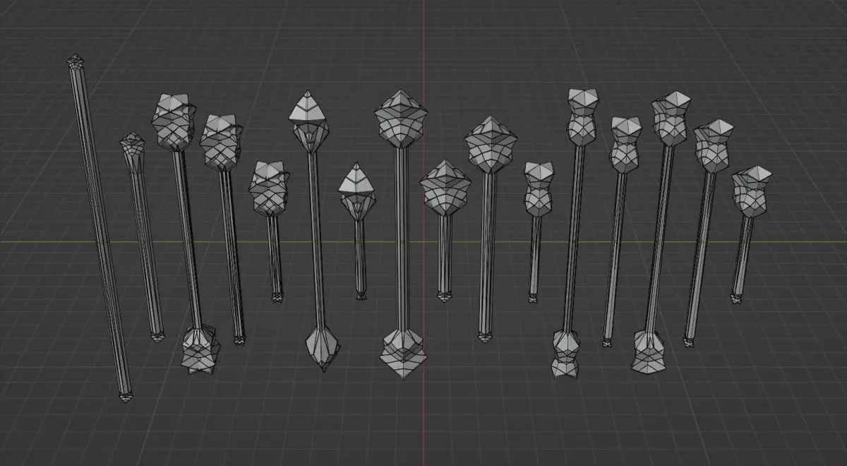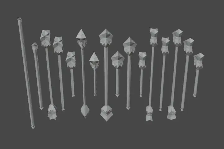 Staff, Smaller Hammer 2 Hands, Hammer 1 Hand, Hammer 2 Hands, 90° Rounded Hammer 1 Hand: 1,490 Vertices / 1,492 Polygons.