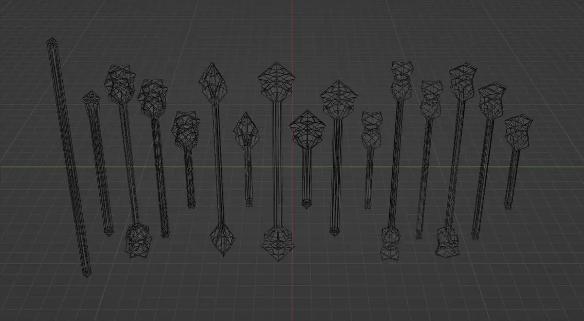 This pack contains 16 differents hammers (and staff) made from the same kind of 3D structure (in different versions and for 1, 2 hands and with 2 sides)
