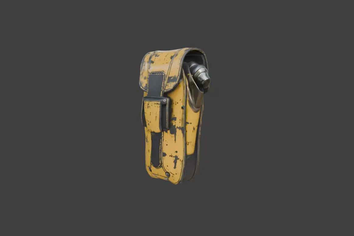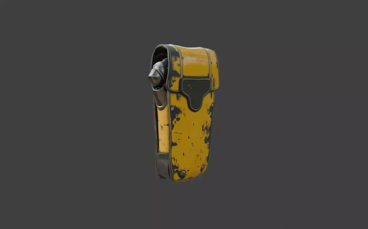 Featuring a bold industrial yellow exterior with worn paint, surface scuffs, and realistic edge damage, the pouch immediately communicates durability and field use. The color choice evokes hazard markings, construction gear, and high-visibility tactical equipment often seen in futuristic military and industrial settings. The distressed texture work enhances immersion, suggesting prolonged exposure to combat, urban decay, and high-intensity operations.