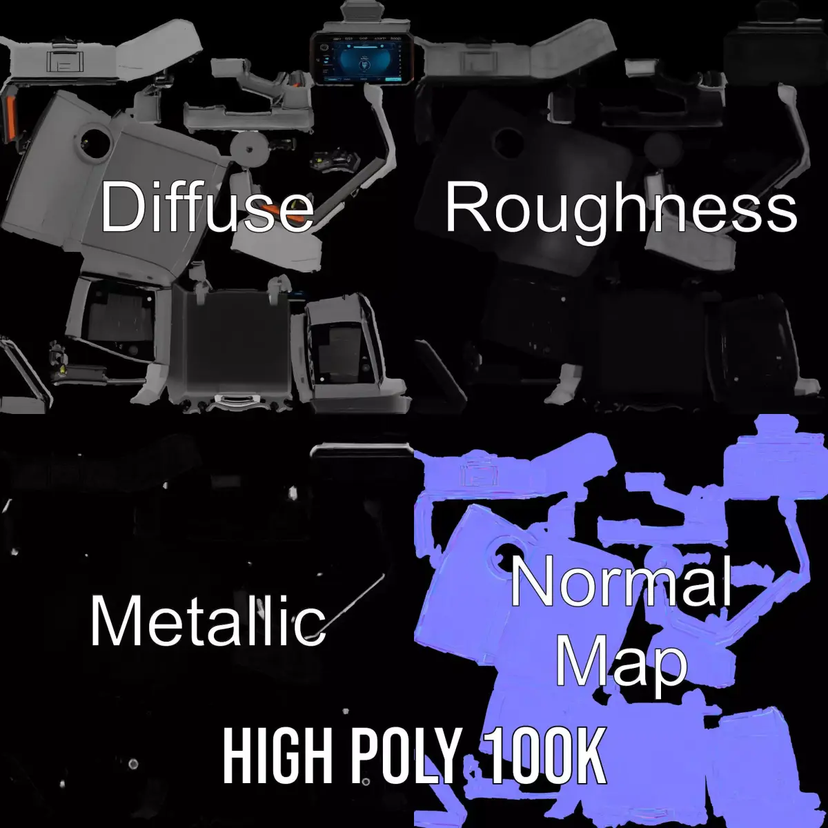 This futuristic device console model pack is perfect for any sci-fi or tech-centric environment. Each model has 3 levels of detail: low-poly (1000 triangles for mobile), middle-poly (10,000 triangles for the environment), and high-poly (100,000 triangles), which allows for use in production rendering (such as 3ds Max, Maya, Cinema4D, Blender, Vray/Corona/Cycles, and more), game engines (Unity and Unreal compatible), and interactive presentations, providing a choice of detail based on the LOD system principle. Ideal for VR experiences, sci-fi films, and gaming scenarios. The model's textures are PBR, Diffuse, NormalMap, and reflection/roughness/metallic, suitable for any modern rendering engine. All models are accurately unwrapped and have no overlapping UVs. All textures are 4096*4096 in size.