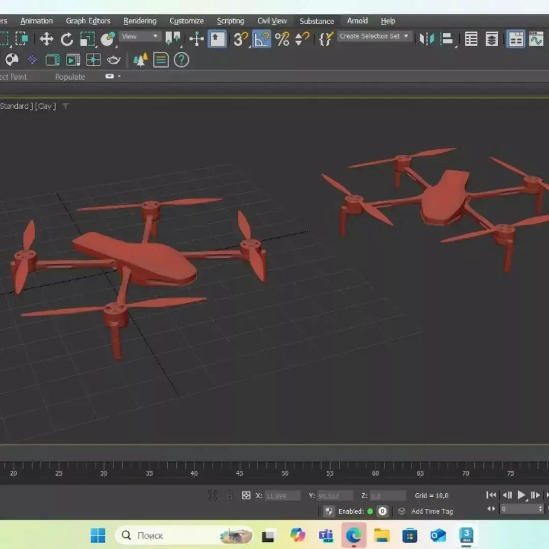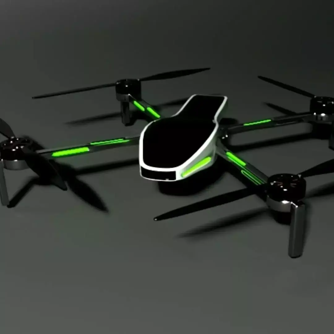 This 3D model presents a sleek and futuristic quadcopter drone concept designed with a strong emphasis on modern aesthetics and technological precision. The streamlined central body features smooth, aerodynamic curves that suggest speed, efficiency, and advanced engineering.