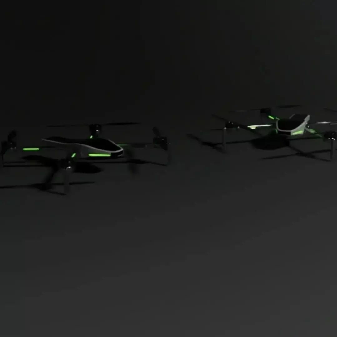The four symmetrical arms extend confidently from the core structure, each supporting powerful rotor assemblies engineered for stability and balanced flight. Integrated neon-green light strips along the arms and fuselage enhance the drone’s high-tech identity, creating a striking contrast against the dark, polished surfaces. These illuminated accents symbolize intelligence, innovation, and next-generation mobility.