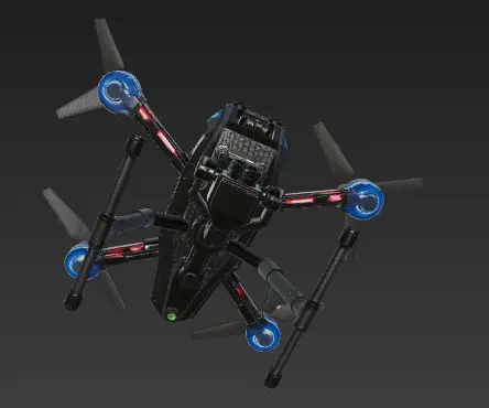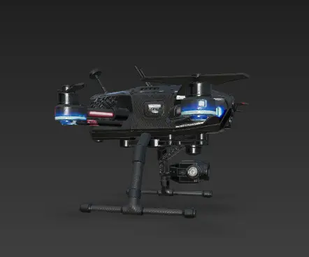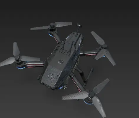 This 8K ultra-high-definition rendering captures a cutting-edge quadcopter drone crafted with a sleek matte black carbon fiber body. Its aerodynamic design features angular edges, four high-performance brushless motors with carbon fibre propellers, and retractable landing gear equipped with shock absorbers. A high-resolution camera gimbal is mounted beneath for aerial imaging, while LED navigation lights in blue and red enhance visibility. Glowing status indicators and an advanced front-facing sensor array highlight its next-gen capabilities. Realistic surface wear and weathering bring authenticity to the photorealistic materials, set under dramatic lighting that emphasises the exposed carbon fibre weave and technical precision