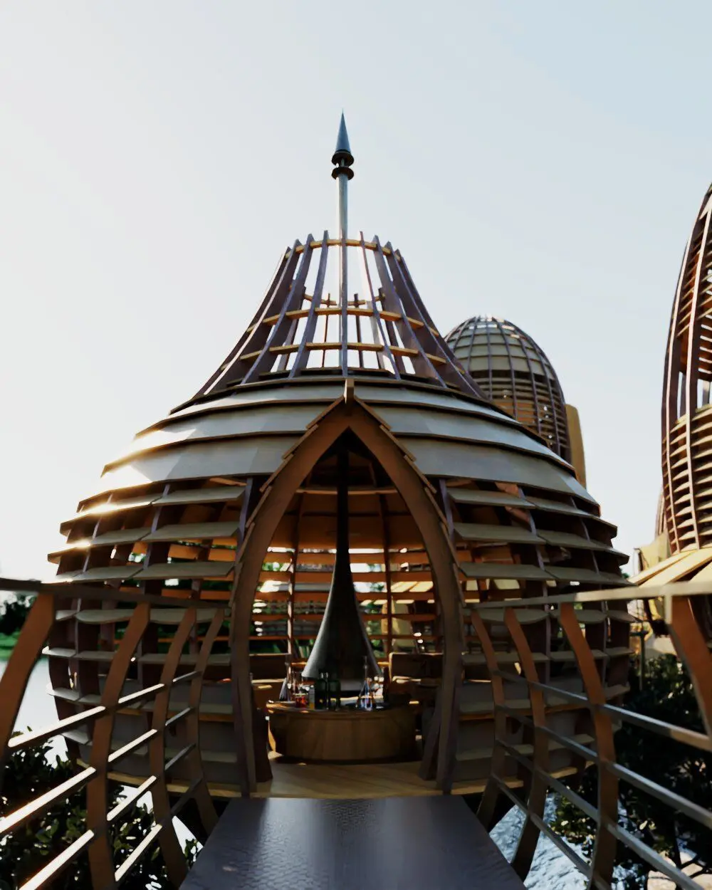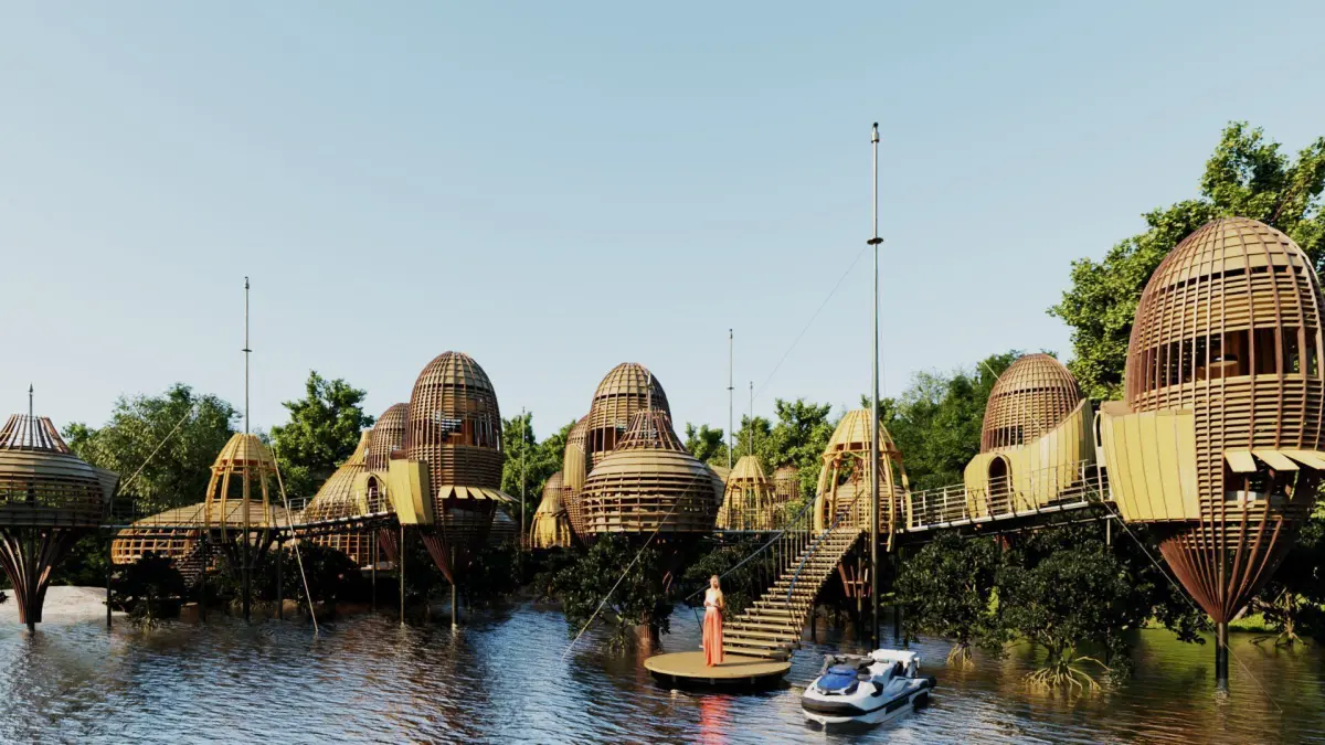 - Private suites in elevated pods accessed via wooden curved bridges