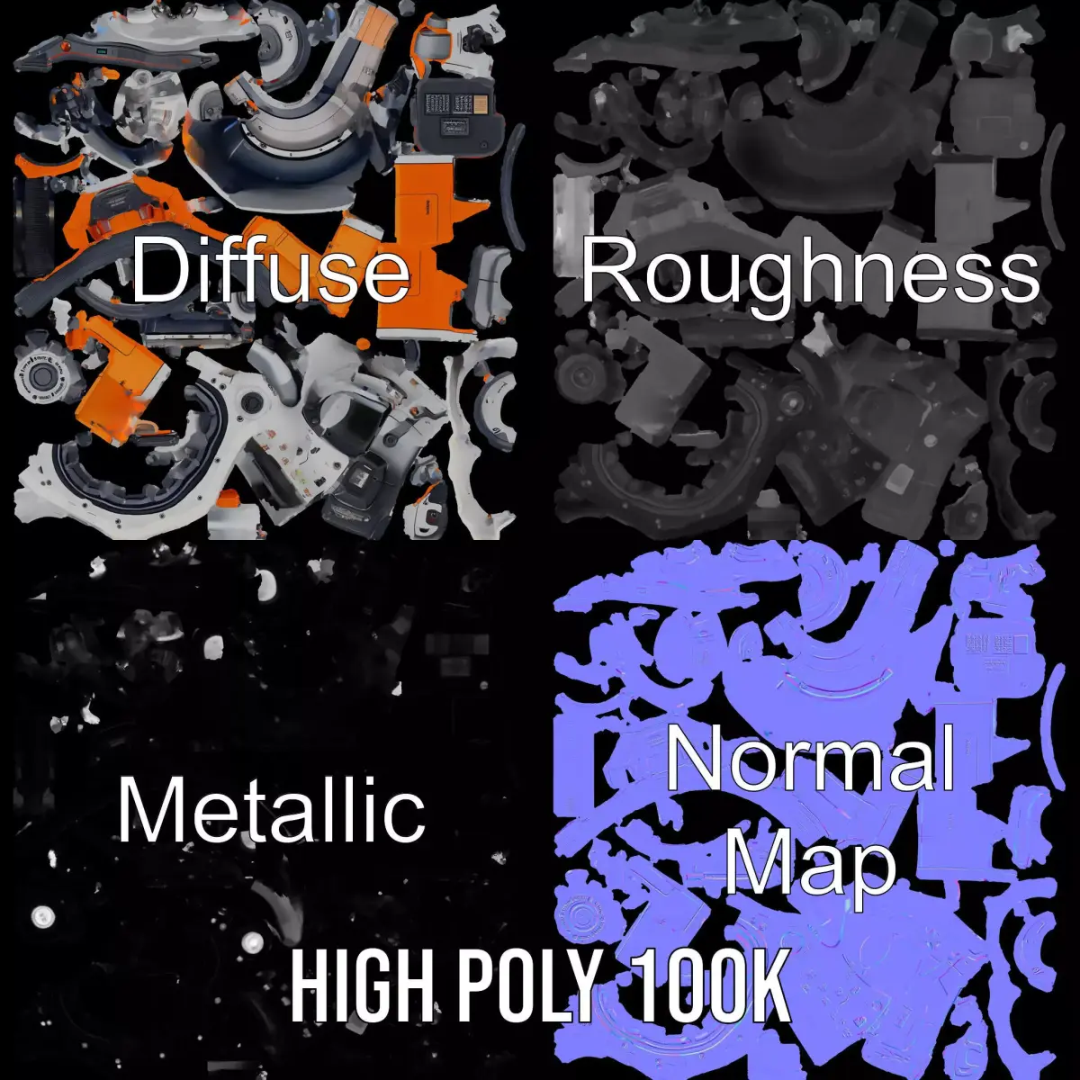 This futuristic engine component model pack offers a highly detailed and versatile asset ideal for sci-fi environments, mechanical scenes, and technology-focused presentations. Each model has 3 levels of detail: low-poly (1000 triangles for mobile), middle-poly (10,000 triangles for environment), and high-poly (100,000 triangles), which allows for the use of this model in production rendering (such as 3ds Max, Maya, Cinema4D, Blender, Vray/Corona/Cycles and all others), game engines (Unity and Unreal compatible), and interactive presentations, providing a choice of detail based on the LOD System principle. The model's textures are PBR, Diffuse, NormalMap, and reflection/roughness/metallic, which are suitable for any modern rendering engine. All models accurately unwrapped and have no overlapping UVs. All textures are 4096*4096 in size.