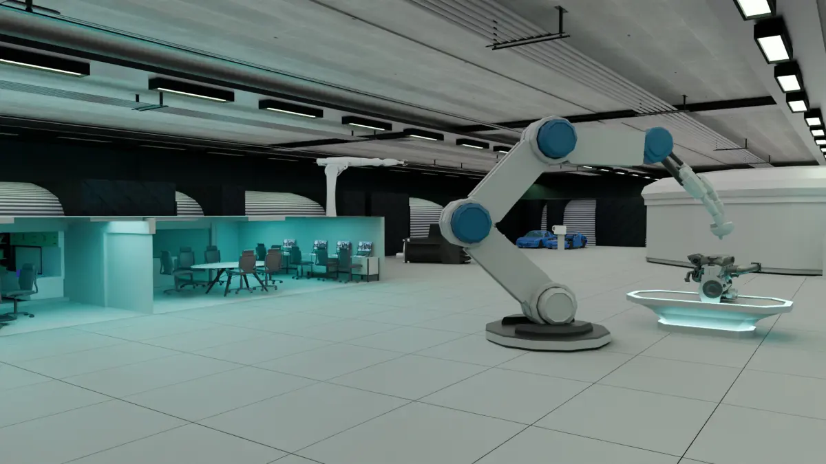Key Features: Industrial Machinery & Engine Bay: Includes high-tech machines, control panels, and various engine models with a clean, sci-fi aesthetic.