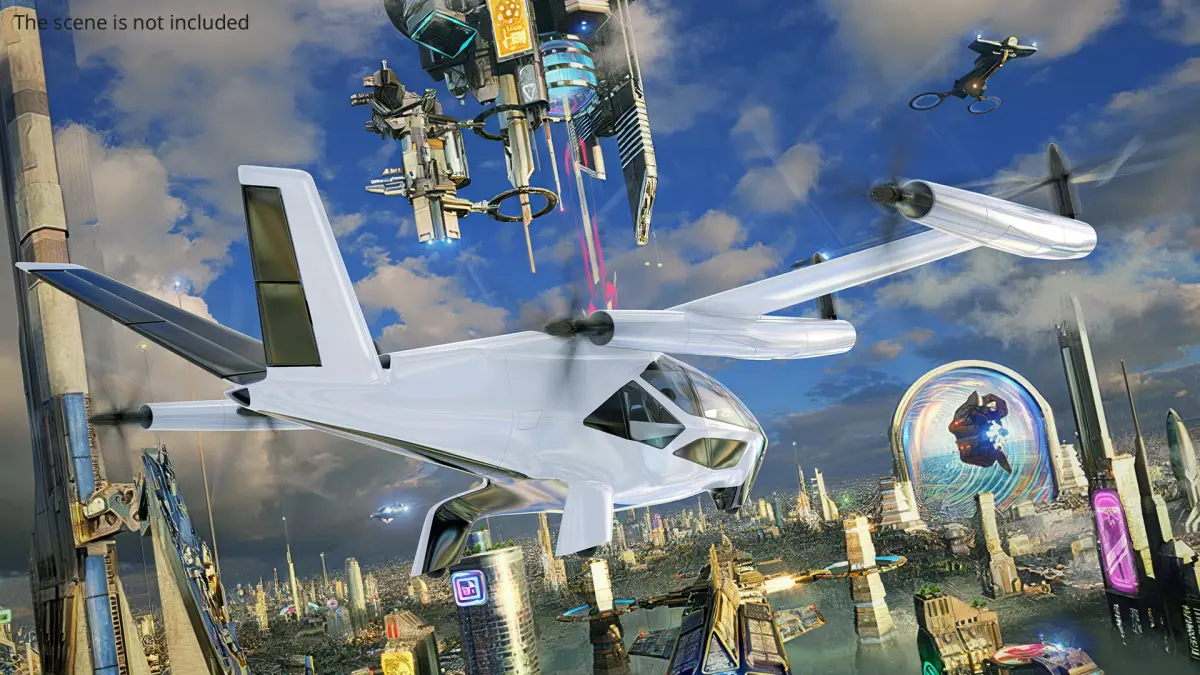 Futuristic eVTOL Aircraft with Urban Design Light On White Rigged is a 3d model of an innovative eVTOL aircraft, designed for efficient vertical and horizontal flight.