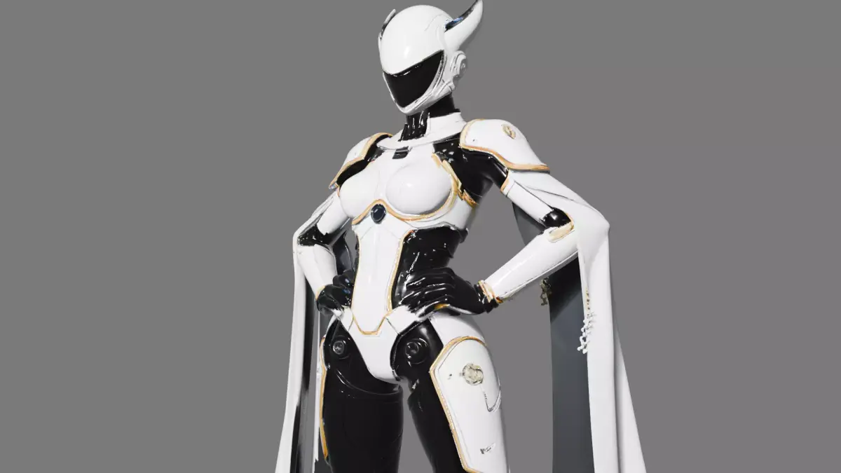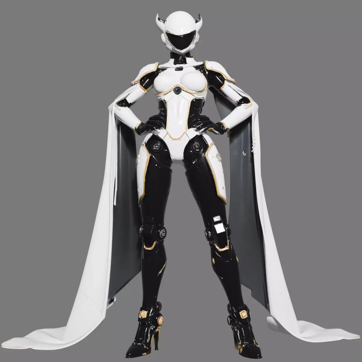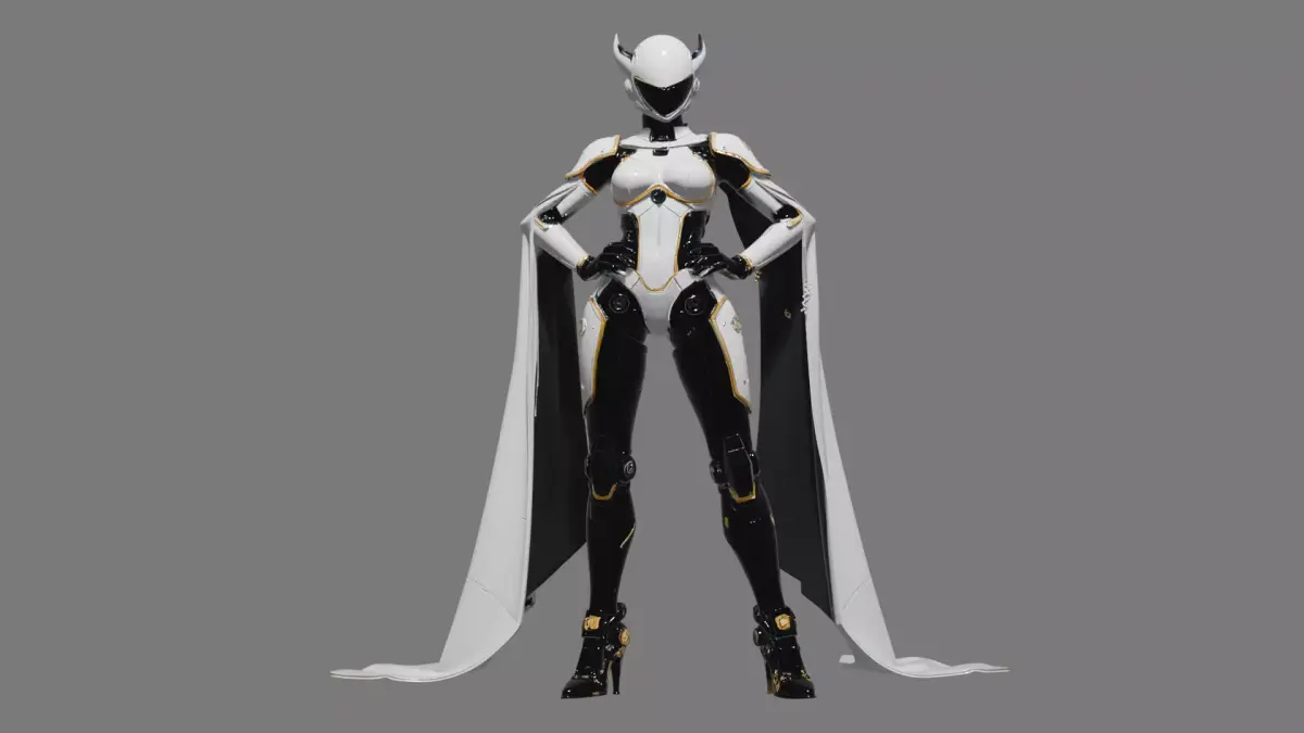 This White Gold Cyber Heroine is a stunning 3D model of a sleek, futuristic female android, designed with a striking black, white, and gold color scheme. Her sculpted armor, flowing dual-layer cape, and angular helmet with horn details create a powerful, heroic silhouette that stands out in sci-fi environments.Perfect for games, animations, or concept art, this model balances elegant, feminine proportions with a high-tech, battle-ready aesthetic. It is ideal for protagonists, elite characters, or cybernetic guardians in your projects.