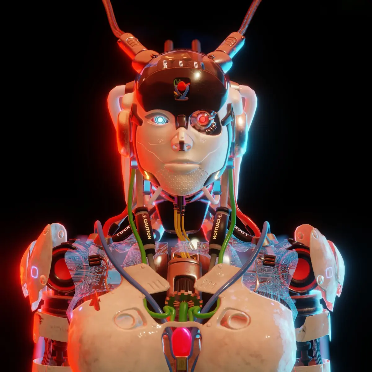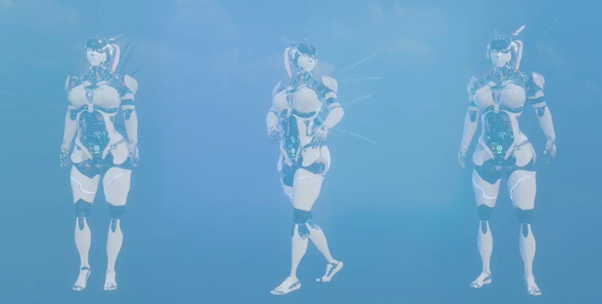 Realistic futuristic female robot with a sleek, humanoid design. Features a metallic exoskeleton, LED accents, and polished surfaces with intricate mechanical details. Equipped with expressive digital eyes, articulated joints, and advanced tech enhancements like arm panels and a holographic interface. Ideal for sci-fi, cyberpunk, or high-tech 3D projects.