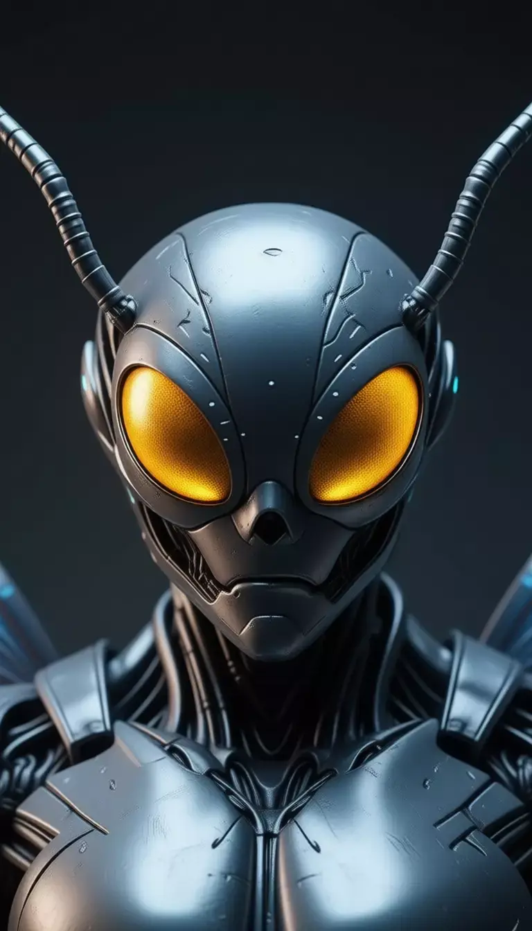 Her head is sleek and angular, featuring glowing amber-yellow eyes that pierce through the darkness, exuding intelligence and mystery. Two slender antennae extend upward from her skull, reinforcing her hybrid nature as both machine and living organism. Her limbs are articulated and powerful, ending in clawed hands and feet that suggest precision movement and grip. The overall aesthetic is clean, minimalist, and highly stylized — evoking the spirit of “Ghost in the Shell,” “Alita: Battle Angel,” “Cyberpunk 2077,” or “Halo” — making it ideal for audiences who appreciate high-tech fantasy and cinematic scale.