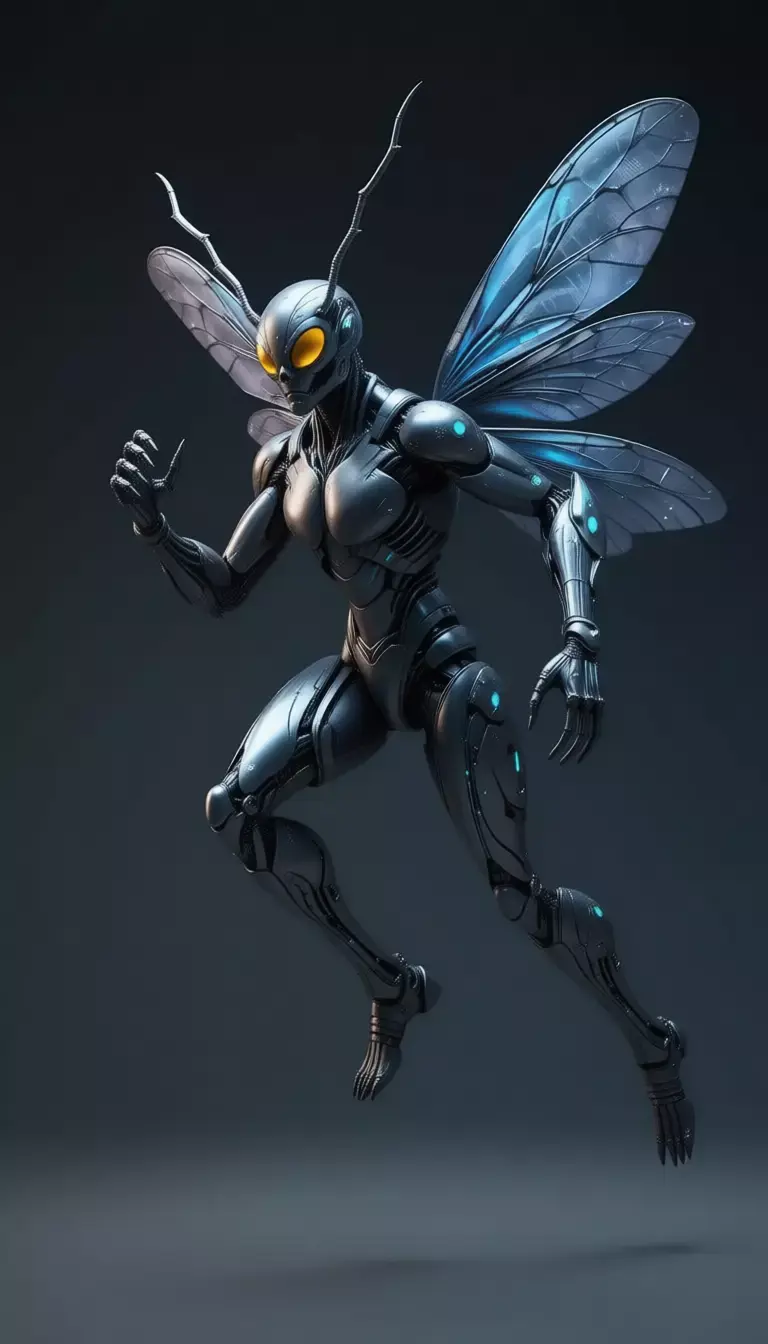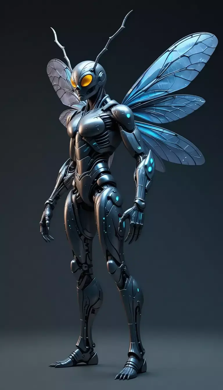 This mesmerizing 3D render showcases a futuristic female robot, blending biomechanical design with insectoid elegance. The entire figure is sculpted from glossy, dark metallic plating — resembling polished steel or obsidian — with subtle blue glowing accents along joints and internal circuits that hint at advanced technology. Her form is distinctly feminine, with curved hips, defined waist, and sculpted musculature beneath the armor, evoking both strength and grace. The most striking feature is her pair of large, translucent wings — reminiscent of a dragonfly or wasp — rendered in iridescent blue with delicate vein-like patterns that catch the light with cinematic brilliance.