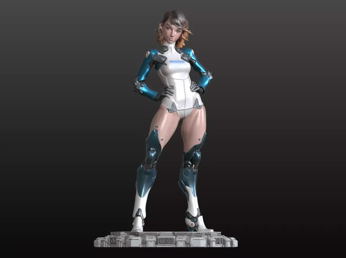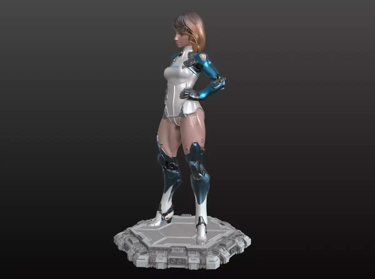 A stunning and stylish 3D model featuring a beautiful futuristic girl designed with a modern sci-fi aesthetic. This collectible character wears a sleek, high-tech suit packed with intricate details, panels, and futuristic textures that give her a strong yet elegant presence. The design balances fashion and science fiction, creating a visually striking figure perfect for contemporary collections.