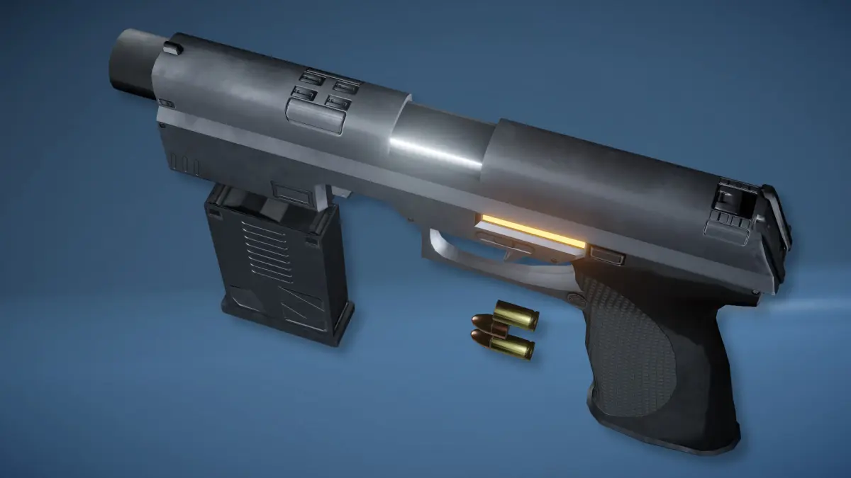 A game-ready futuristic handgun with optional silencer, scope and red dot sight attachments. Also includes a magazine, bullet, bullet tip and casing. Each of these models have LOD models.