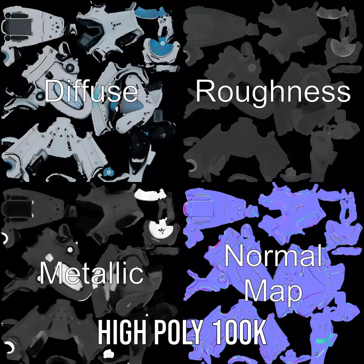 The model's textures are PBR, Diffuse, NormalMap, and reflection/roughness/metallic, which are suitable for any modern rendering engine. All models are accurately unwrapped and have no overlapping UV.