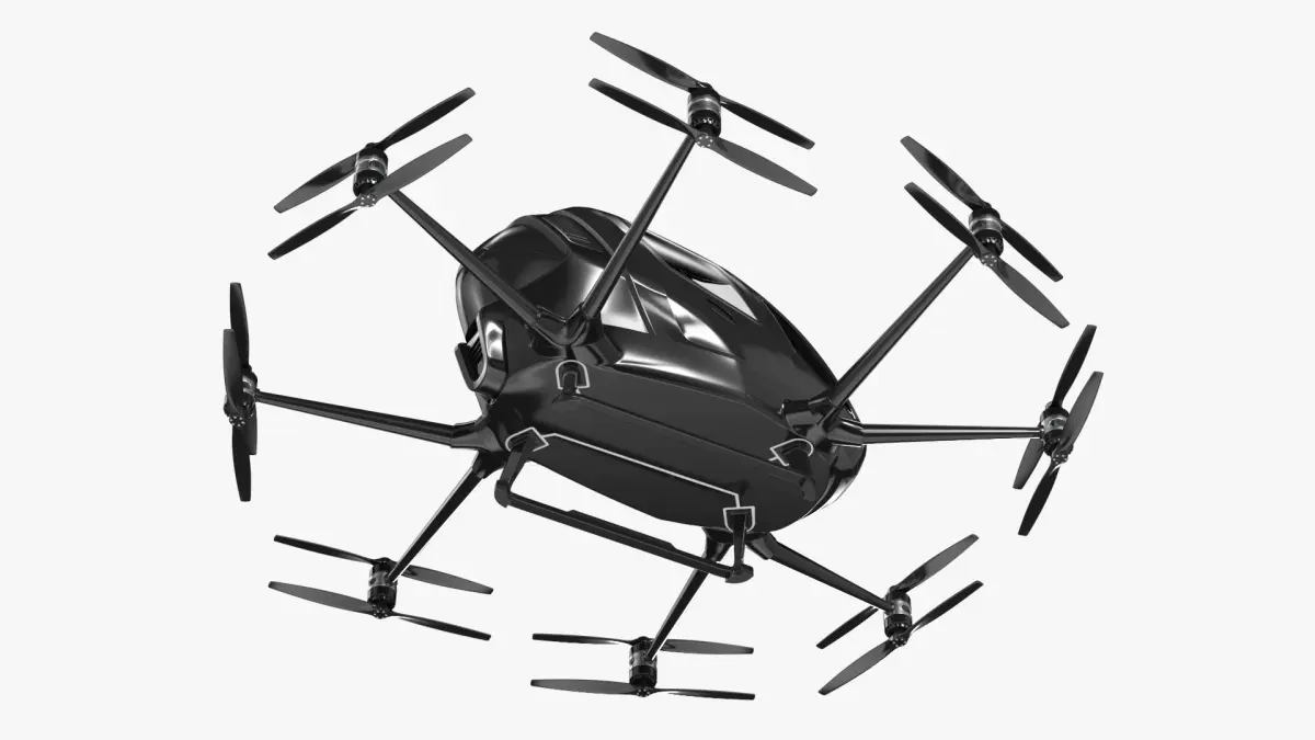 The sleek drone model features a modern, aerodynamic design with multiple propellers for vertical takeoff and landing. Its enclosed cockpit offers safety and comfort, equipped with advanced navigation systems and a panoramic view. The design emphasizes efficiency and style, making it an ideal solution for future urban commuting.