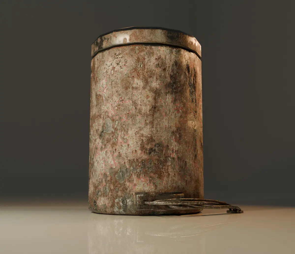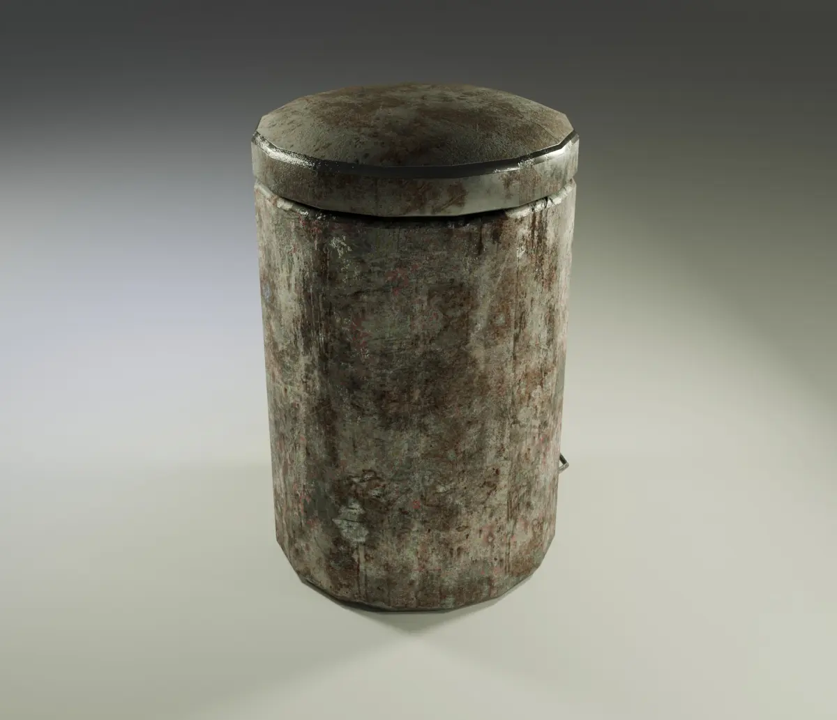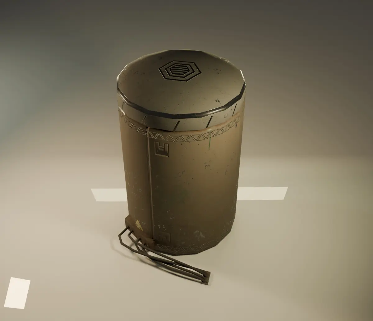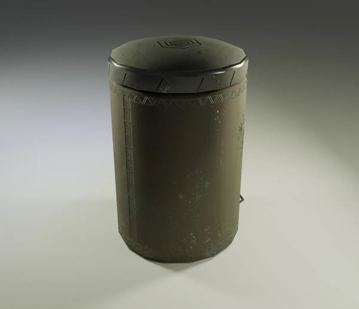 3D model of a cylindrical container with a hexagonal pattern on the lid and markings on the surface, giving it the appearance of a used object. Ideal for science fiction style scenes or industrial environments . Only 3 versions of the model : plain, neon, worn.Textures include: Normal, Base Color, Displacement, Emission, Metallic, Roughness.