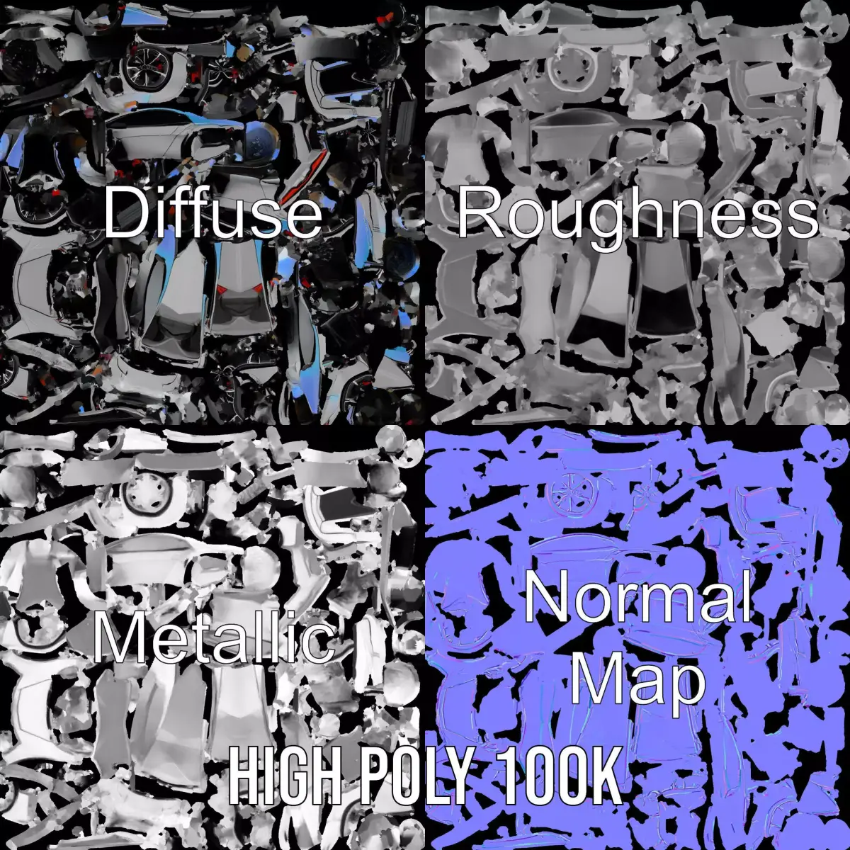 Its aerodynamic design and vibrant color make it ideal for automotive advertisements, virtual showrooms, and cinematic projects. The model's textures are PBR, Diffuse, NormalMap, and reflection/roughness/metallic, which are suitable for any modern rendering engine. All models are accurately unwrapped and have no overlapping UV.