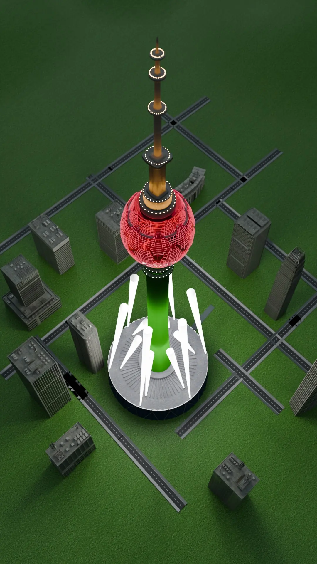 It is better if you use .blend file.This is a high-quality, detailed 3D model of a futuristic tower inspired by iconic architectural designs. The tower features an elegant, modern structure with a spherical top, enhanced with glowing accents and intricate detailing. The model is perfect for use in urban scenes, architectural visualizations, cityscapes, or futuristic concept designs.