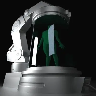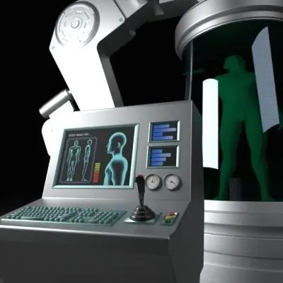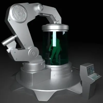 Highly detailed scene of a Futuristic Medical Chamber with Control Console and Human Subject.
