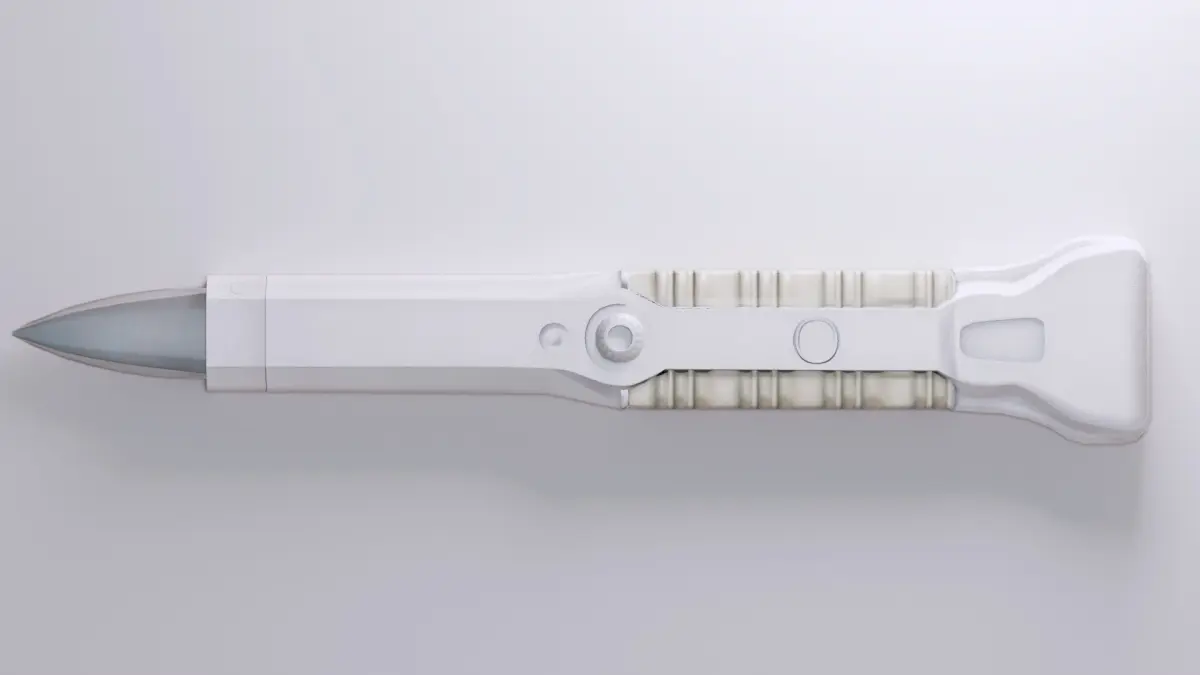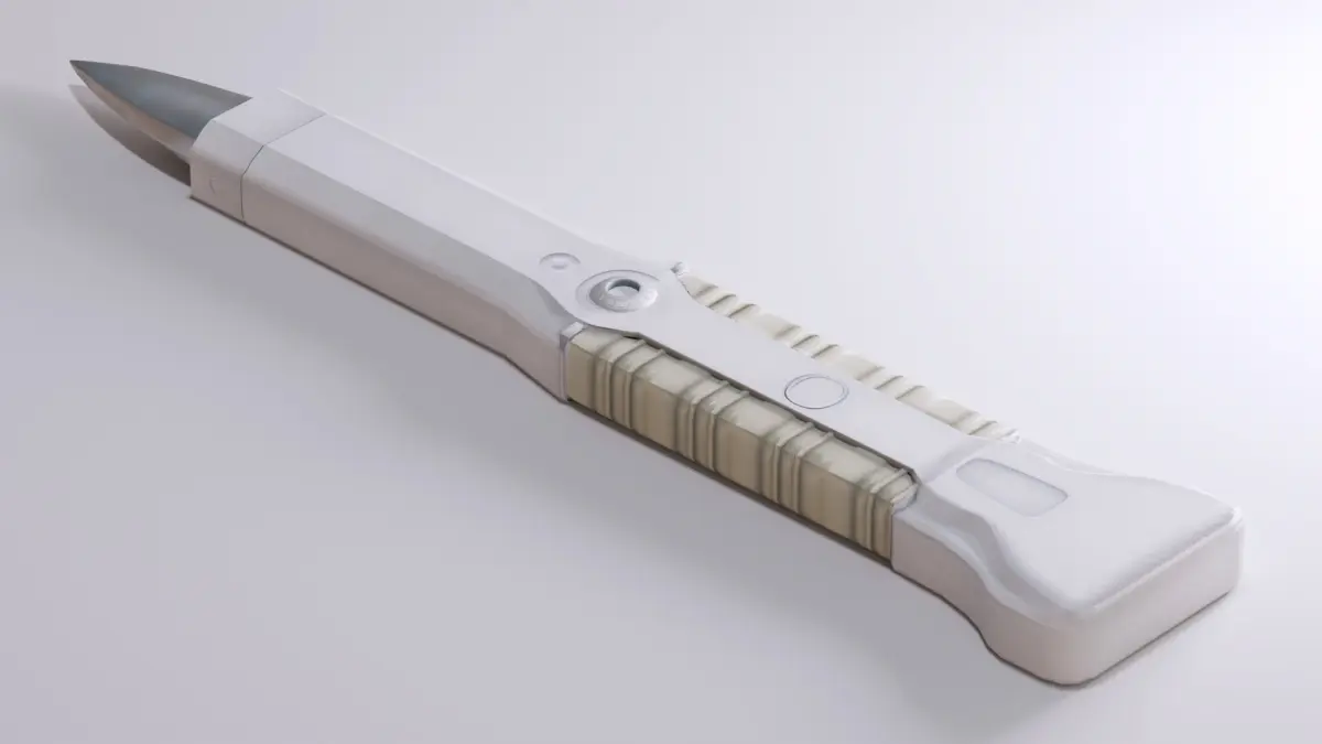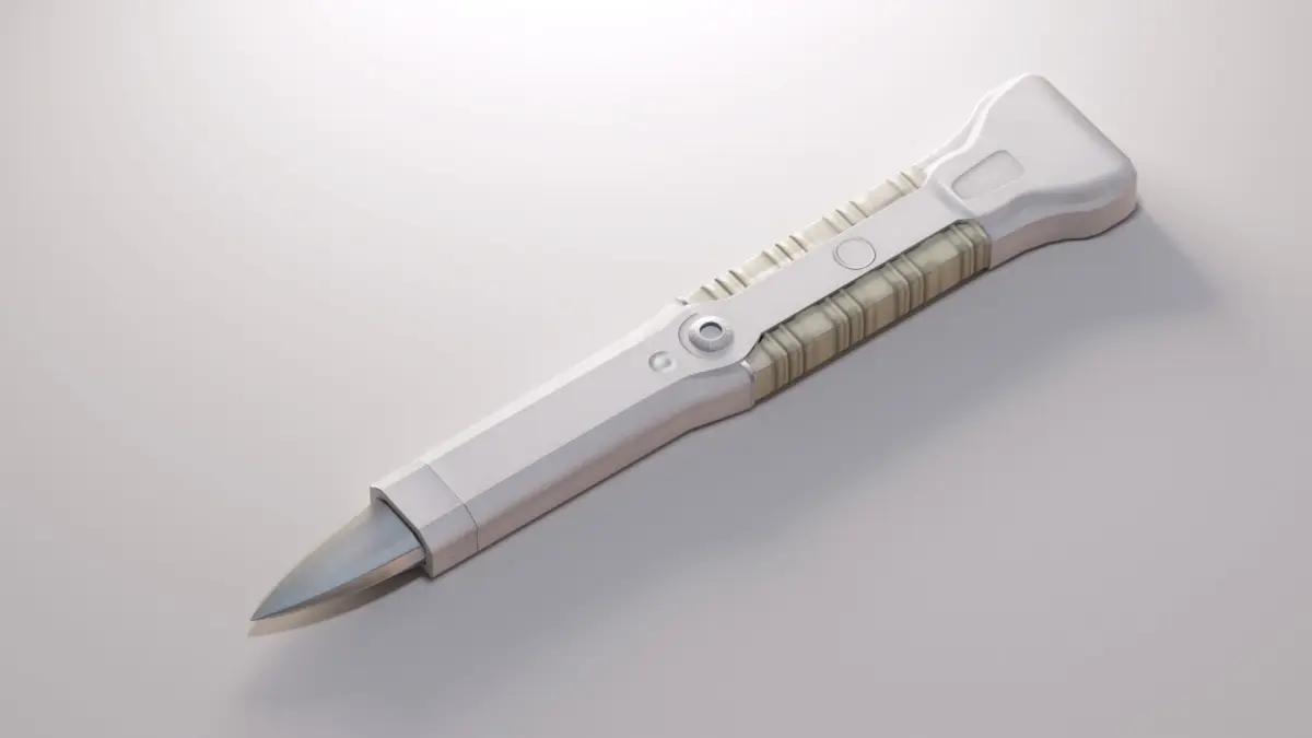 This is a 3D model of a futuristic medical scalpel, designed for sci-fi or modern lab scenes. It has a clean, streamlined look with a sturdy handle and a sharp, metallic blade. Perfect for use in games, VR, or animations, this model is good for any sci-fi medical or laboratory setting.