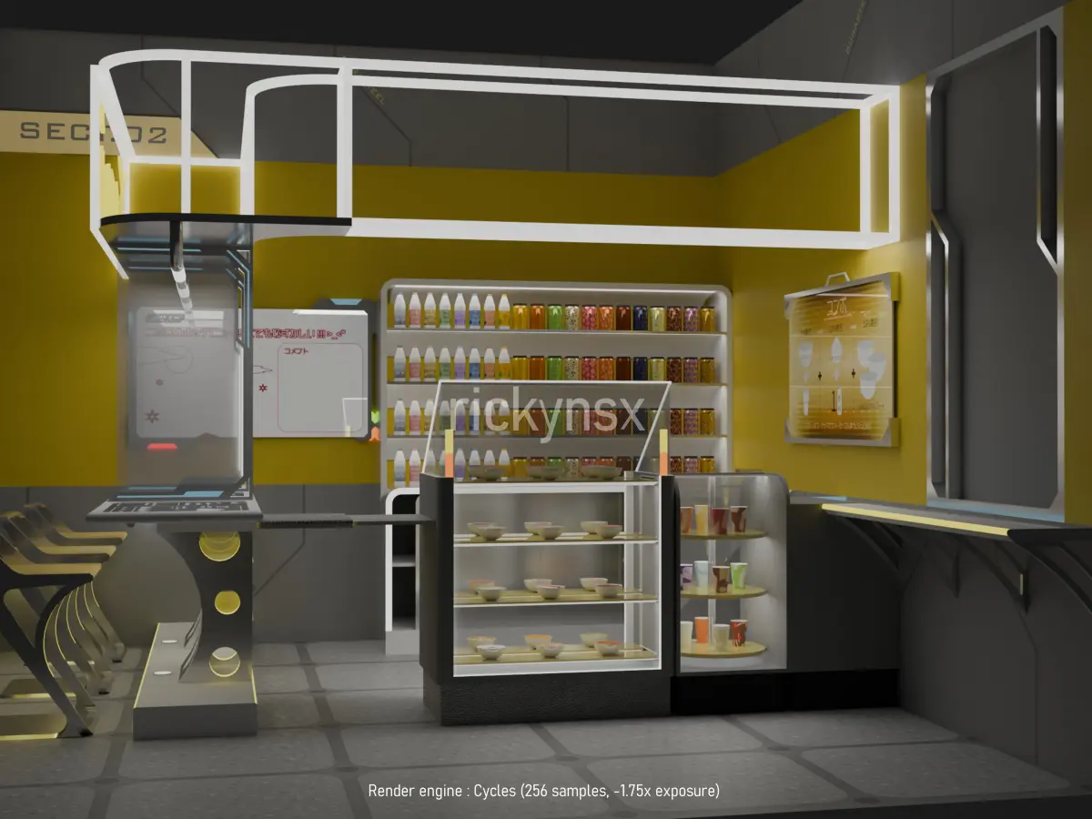 The futuristic mini restaurant furniture set in a fictional world. Yummy.Co currently serves many beverages and main dishes like katsudon, gyudon, salad, etc.