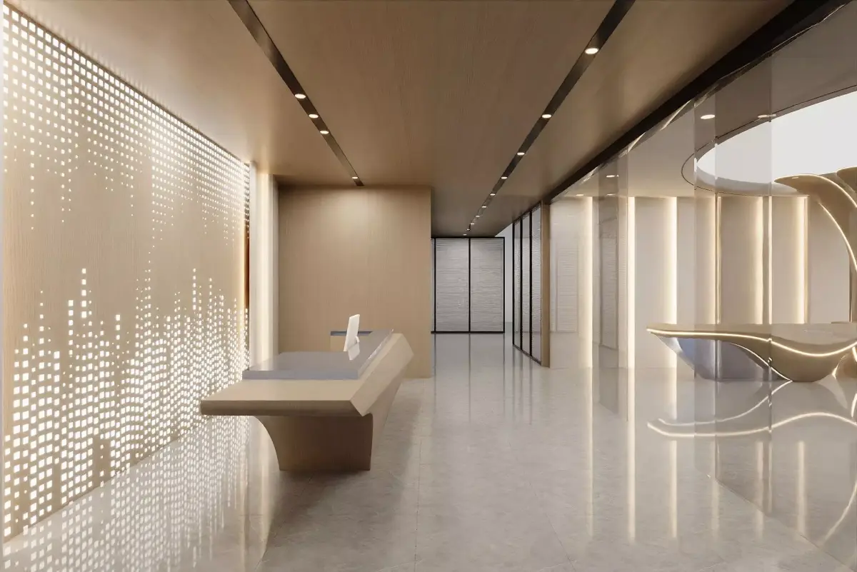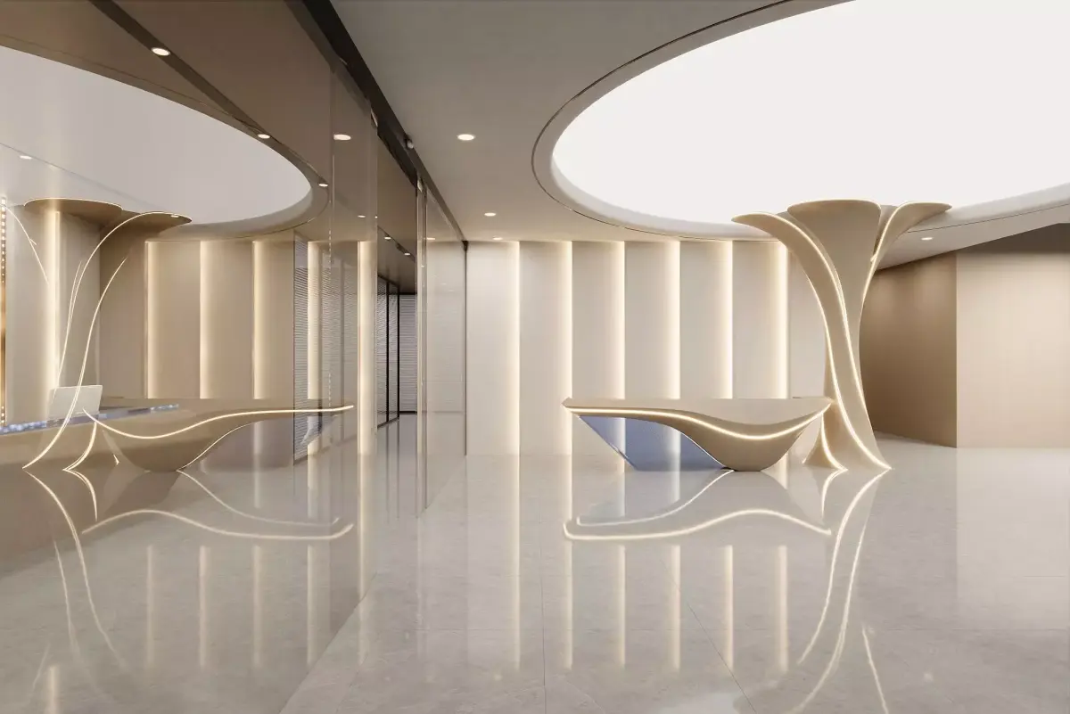 A calm, high-end reception lobby with sculptural flower-like columns, a floating parametric desk and a perforated light wall. Neutral beige palette, wood paneling, ring ceiling and glossy stone floor create a futuristic yet welcoming atmosphere. Architecture and furniture are grouped by function; real-world scale; clean topology; named materials and tidy UVs for quick look-dev. Ideal for corporate lobbies, clinics and wellness entries, exhibition foyers and branding proposals. Ready to customize lighting and materials.