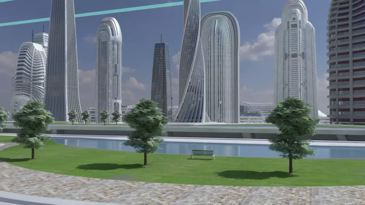 This product includes a complete futuristic city center comprised of 30 unique and detailed buildings, complemented by advanced structures, elevated platforms, gardens, bridges, and street furniture.