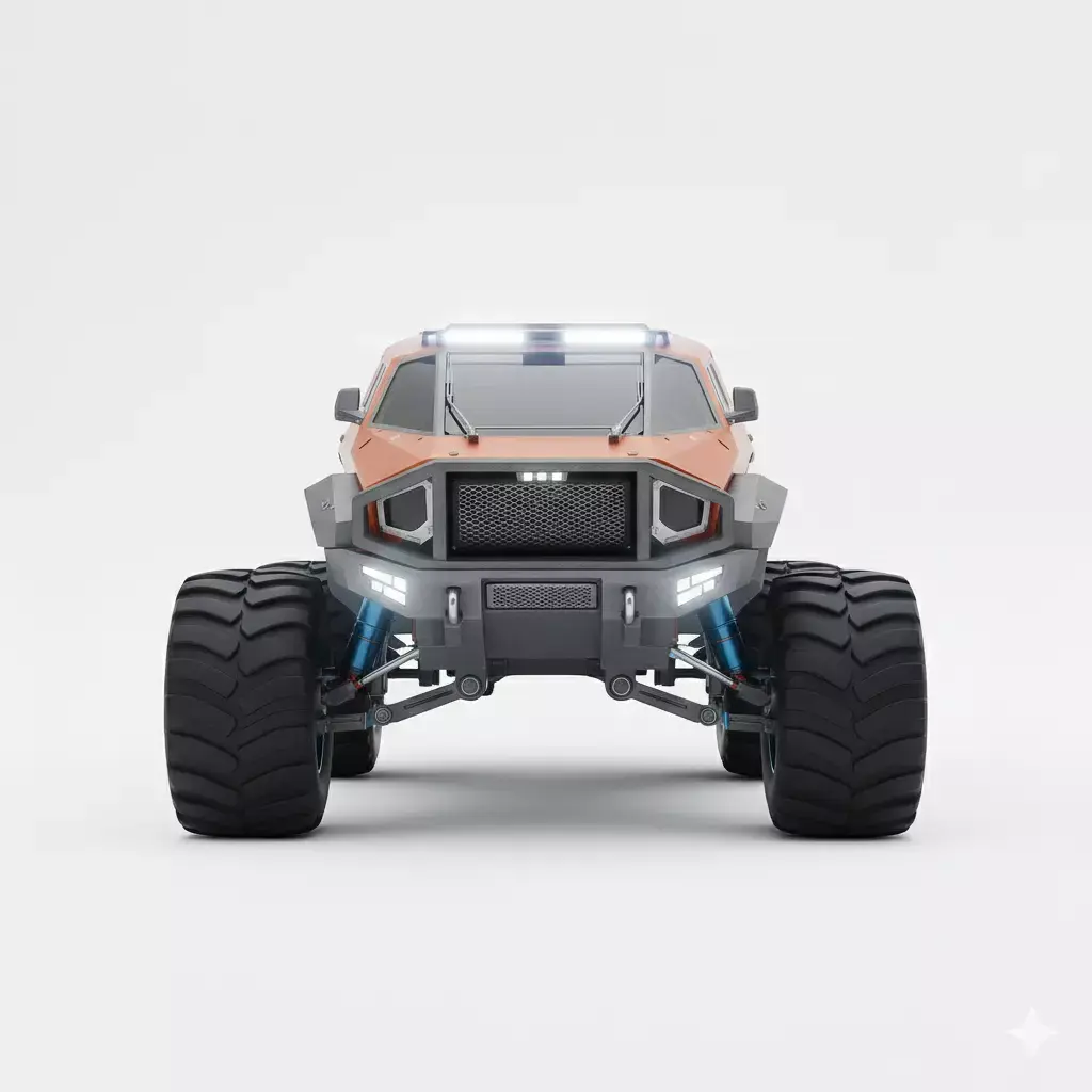 This 3D model depicts a stylized, high-performance off-road SUV designed for rugged terrain and modern aesthetics. The vehicle features a striking dual-tone color scheme, combining a metallic sky blue body with bold orange accents on the grille, hood, and side panels. Engineered for adventure, it is equipped with oversized all-terrain tires, high-clearance wheel arches, and a robust front bumper with integrated skid plates. The clean, two-door compact body style suggests a nimble yet powerful 4x4 concept, perfect for automotive visualization, gaming environments, or conceptual transport design.