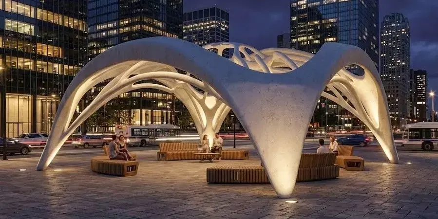 Design Philosophy: Inspired by nature and contemporary architecture (Zaha Hadid style), this urban canopy features a seamless, flowing geometry. Whether rendered as white reinforced concrete for a futuristic look or natural wood for a warm, eco-friendly vibe, this model adapts to any environment.