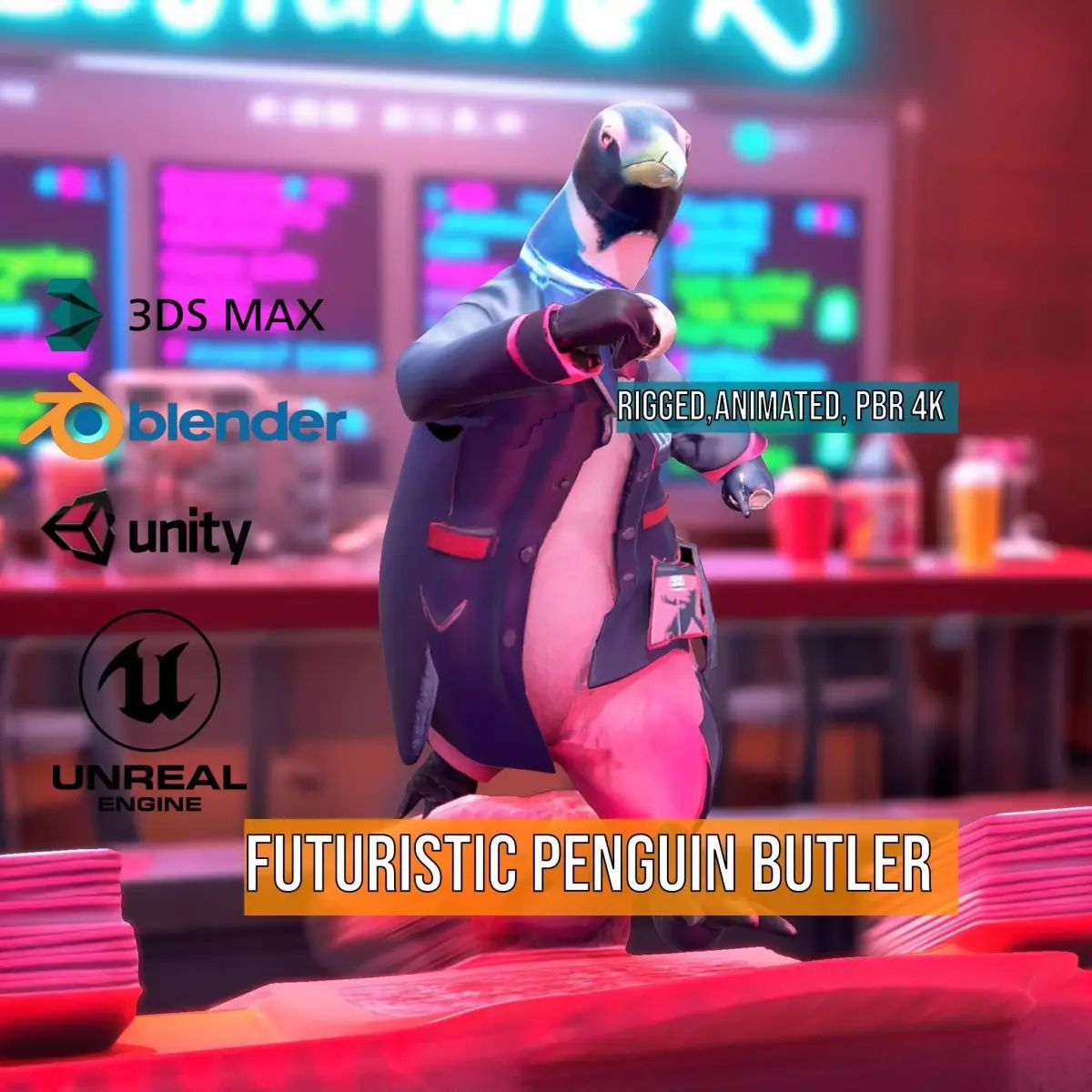 The Futuristic Penguin Butler model pack features a stylish and detailed anthropomorphic penguin suited in a modern, high-tech butler attire, complete with cybernetic enhancements. This unique model is ideal for animation, gaming, VR environments, and promotional media projects. Each model has 3 levels of detail: low-poly (1000 triangles for mobile), middle-poly (10,000 triangles for environment), and high-poly (100,000 triangles), which allows for the use of this model in production rendering (such as 3ds Max, Maya, Cinema 4D, Blender, Vray/Corona/Cycles, and others), game engines (Unity and Unreal compatible), and interactive presentations, providing a choice of detail based on the LOD system principle. The model's textures are PBR, Diffuse, NormalMap, and reflection/roughness/metallic, which are suitable for any modern rendering engine. All models are accurately unwrapped with no overlapping UVs. All textures are 4096*4096 in size. Please like and leave a comment if you enjoyed this model.