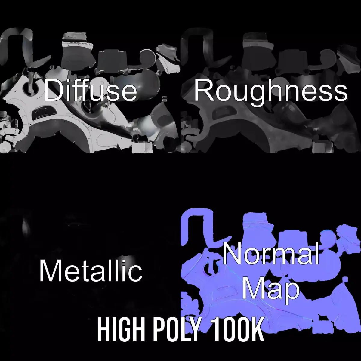 The model's textures are PBR, Diffuse, NormalMap, and reflection/roughness/metallic, which are suitable for any modern rendering engine. All models accurately unwrapped and have no overlapping UV.