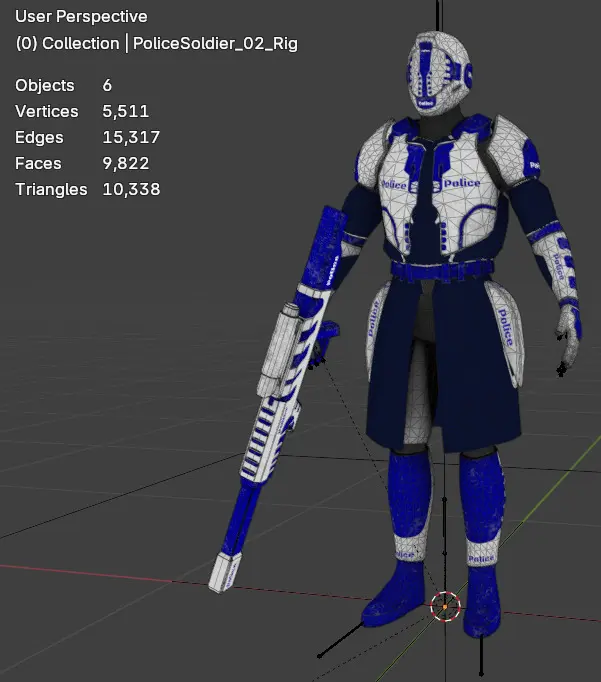 Futuristic Police Soldier ready for your game dev needs. •two materials - soldier armour & gun•Textures Available: Normal Map, Albdeo Map, Metallic Roughness Map (for both weapon and character).•Rigged & Textured File•Blend file included - made with blender 4.2.3•Gun & Character are two sperate meshes weight painted together on the same skeleton/armature, ready for animations to be made.