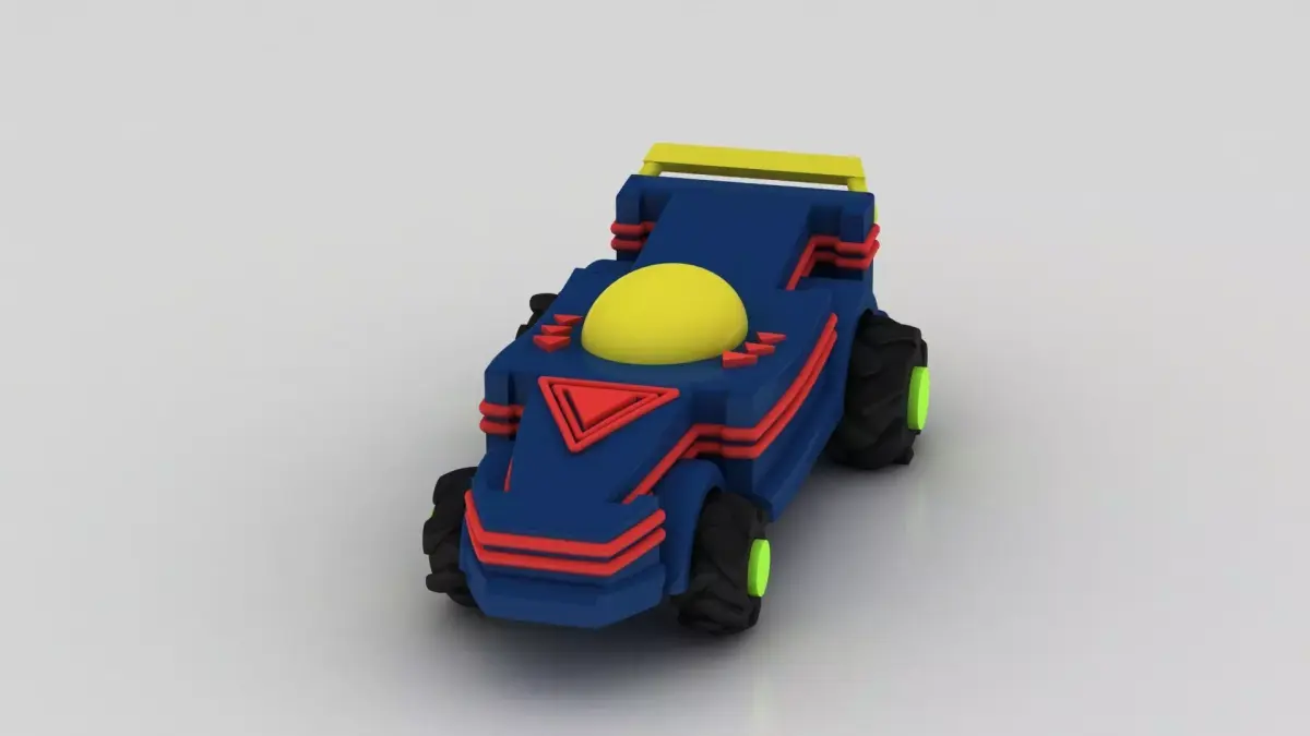 This 3D model features a vibrant, stylized toy race car designed with a futuristic twist. Rendered in bold colors—navy blue body, bright red accents, yellow dome cockpit, and neon green wheel hubs—it captures the essence of retro-futuristic speed and fun. Ideal for children’s games, collectibles, racing animations, or 3D printing, this model combines playful design with geometric detail.