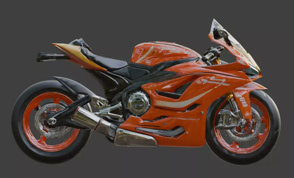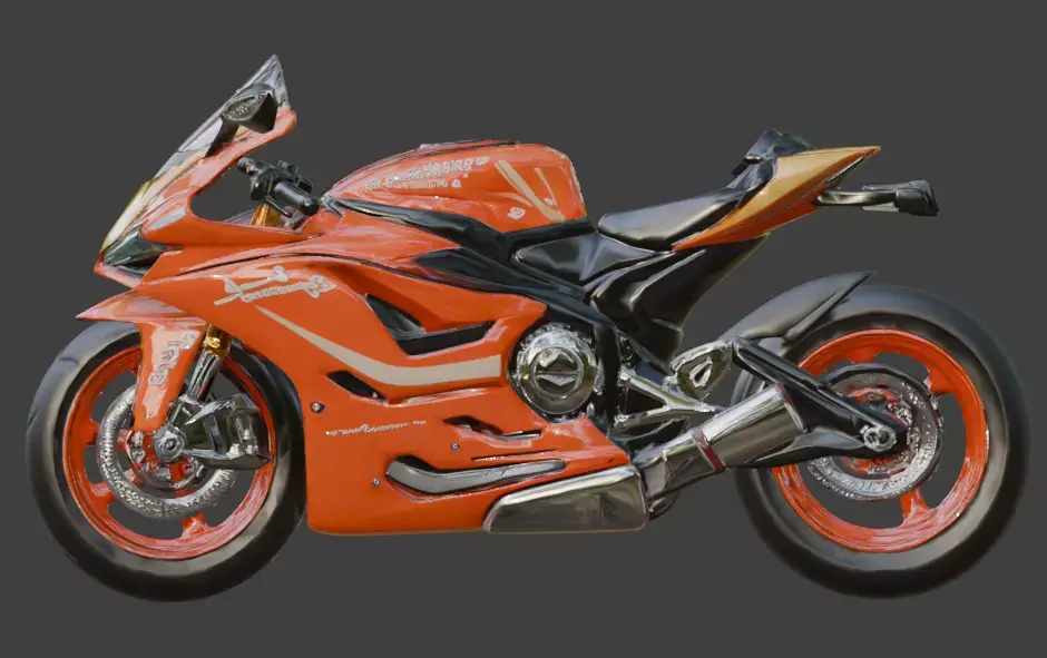 Tagsracing motorcycle, sportbike, futuristic, stylized, cartoon, cinematic style, orange, yellow, neon, high speed, 3d model, game asset, sci-fi