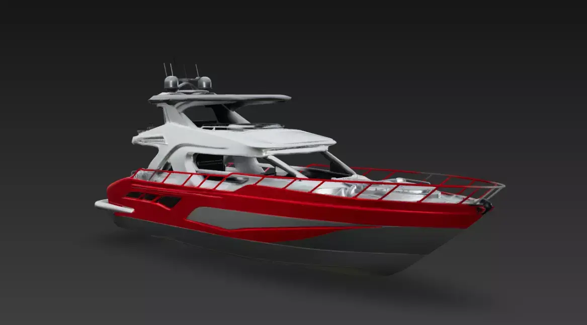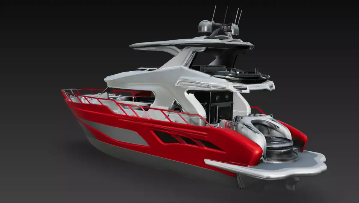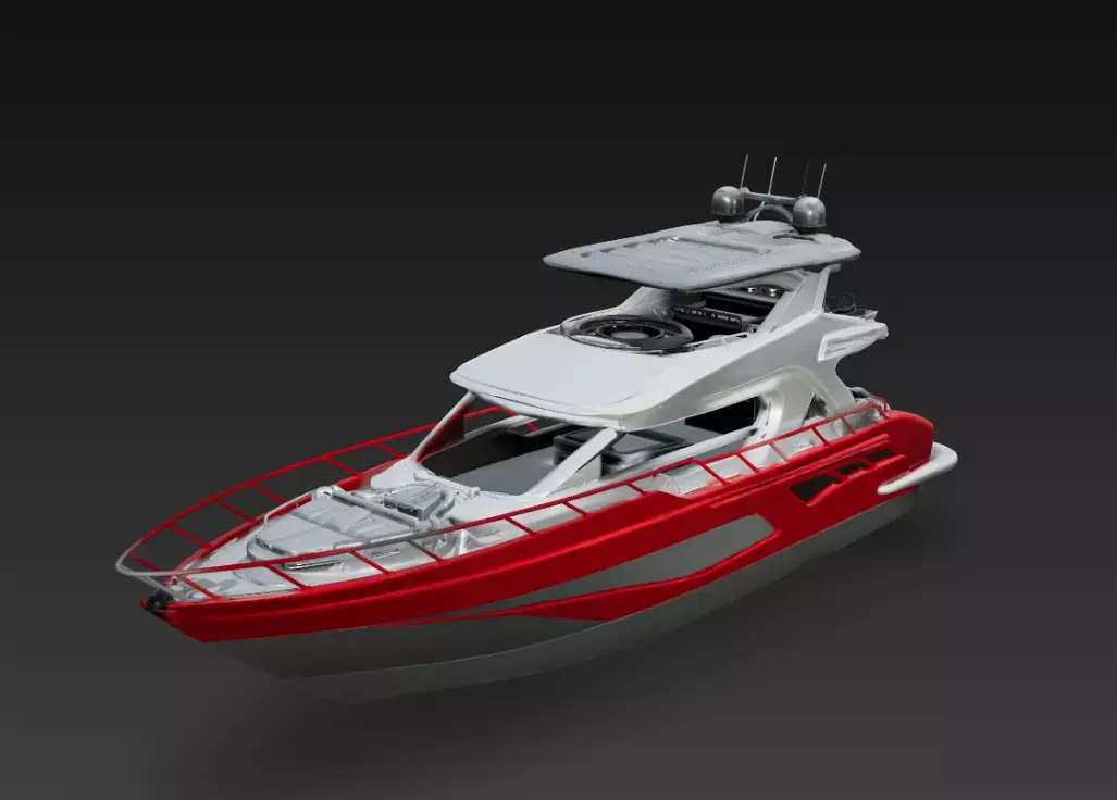 Futuristic Red Sport Yacht with Flybridge is a high-detail luxury motor yacht model featuring an aggressive modern hull design, aerodynamic flybridge structure, and striking red metallic body finish. The sharp side lines, extended front deck, and sculpted rear platform create a powerful and futuristic marine silhouette.