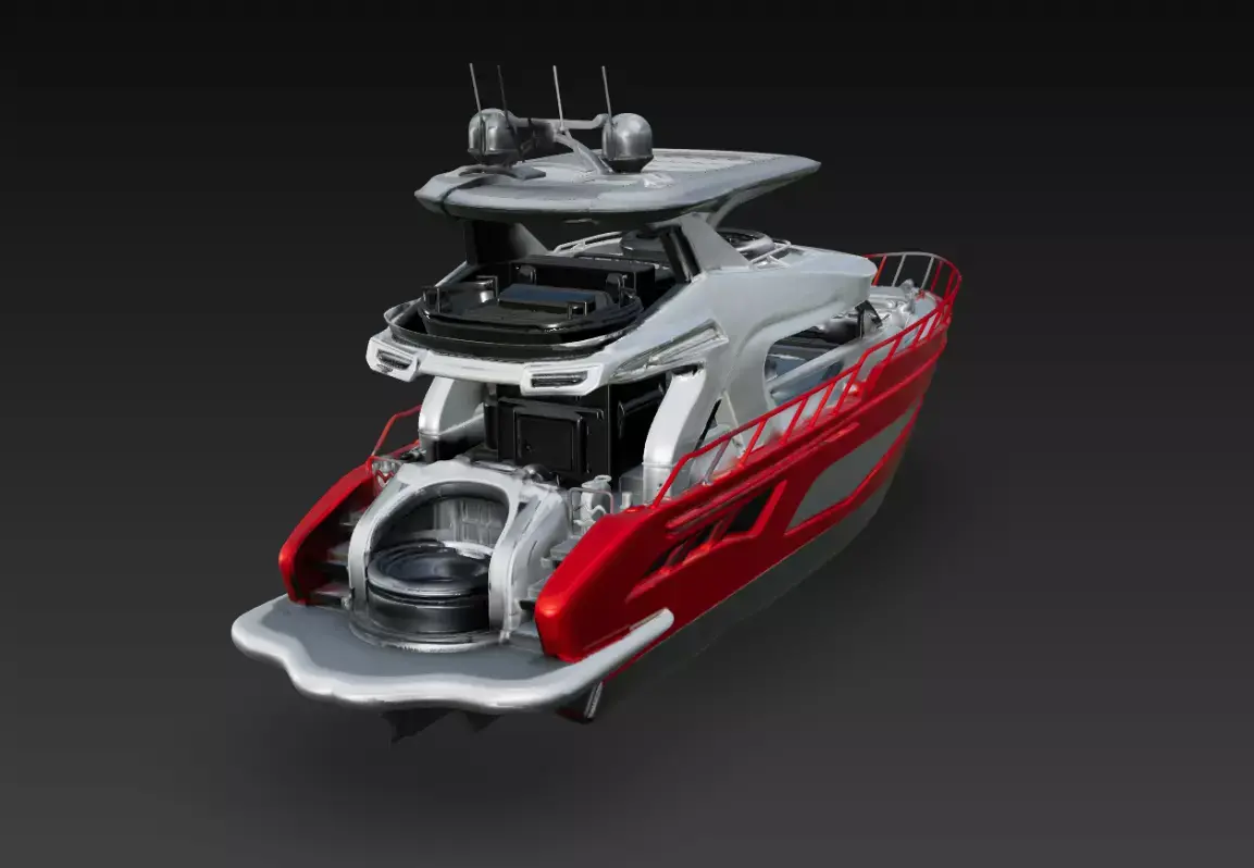 This model showcases premium exterior detailing including panoramic side windows, safety railings, modern radar and antenna systems, layered upper deck architecture, and a streamlined sport yacht profile. The bold color scheme and smooth surface transitions make it highly attractive for high-end visualization and showcase renders.