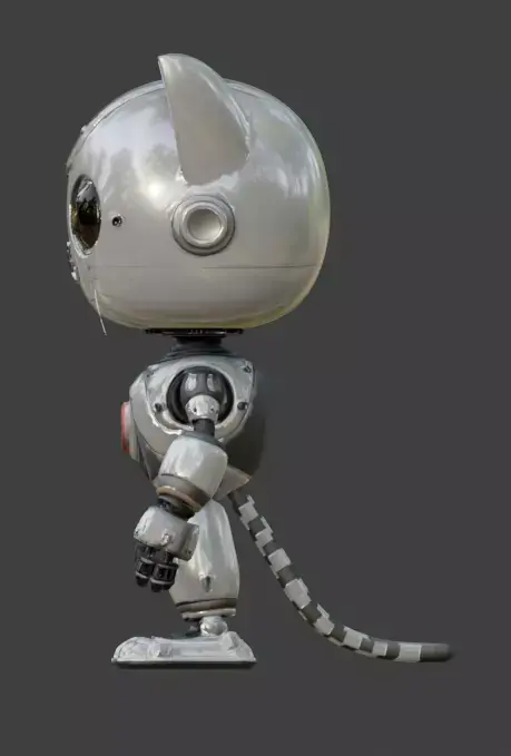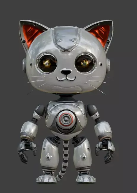Key FeaturesMechanical Feline Proportions: Features a large rounded head and a compact body with stylized mechanical limbs optimized for a cute silhouette.