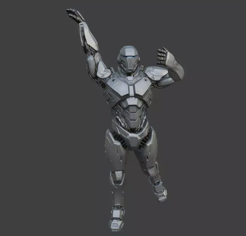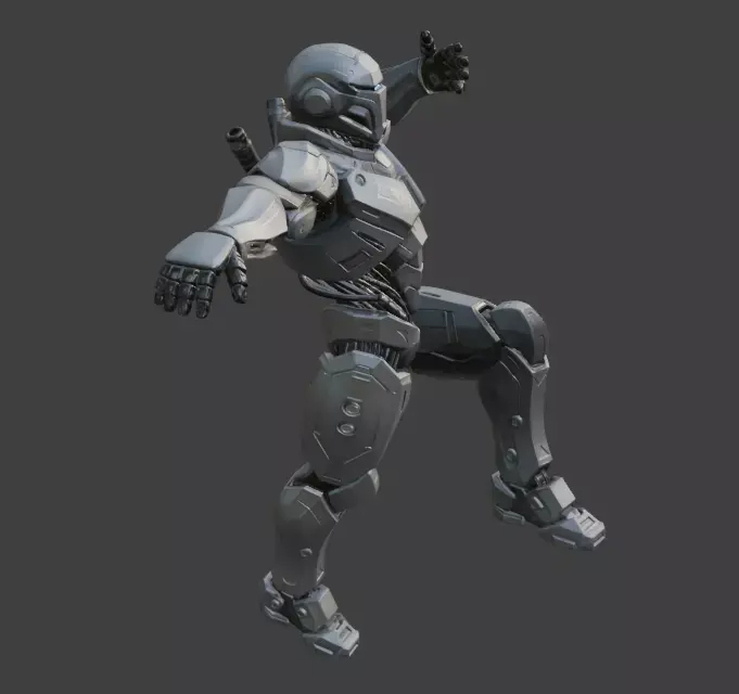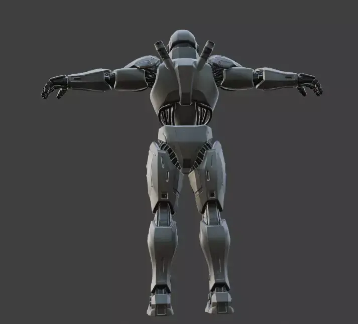 This is a highly detailed 3D model of a futuristic robotic soldier designed for sci-fi environments. Standing in a T-pose, the model features a sleek, angular exoskeleton with matte gunmetal-gray alloys, reinforced joints, and intricate mechanical detailing. The helmet-like head includes a glowing blue visor, while armor plates cover the chest, shoulders, and limbs, accented with circuit-like patterns. Hydraulic pistons and exposed wiring enhance its gritty, utilitarian design. The model includes rigging for animation, making it ideal for games, films, or simulations. Rendered against a neutral background, it exudes a dystopian military aesthetic with no weapons, focusing on form and structure.