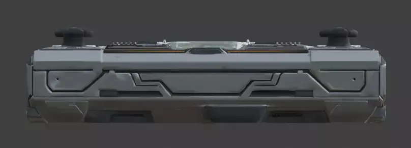 The design highlights a robust modular chassis equipped with dual analog thumbsticks, a central multi-paneled touch interface or solar array, and integrated glowing status indicators. To enhance visual depth, the device features recessed panel lines, textured grip surfaces, and side-mounted emissive light bars. Engineered with an ultra-efficient low-poly count under 5,000 polygons, this asset is perfectly optimized for real-time game engines, VR/AR applications, and high-performance mobile rendering.