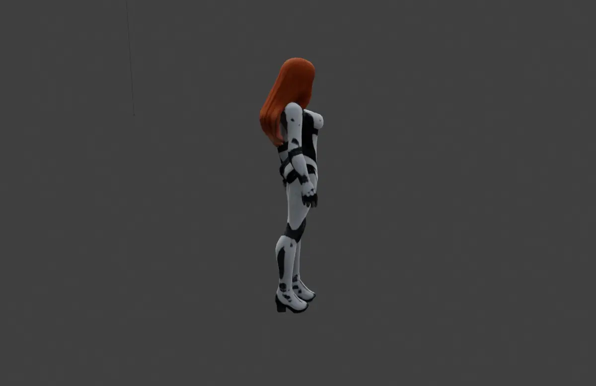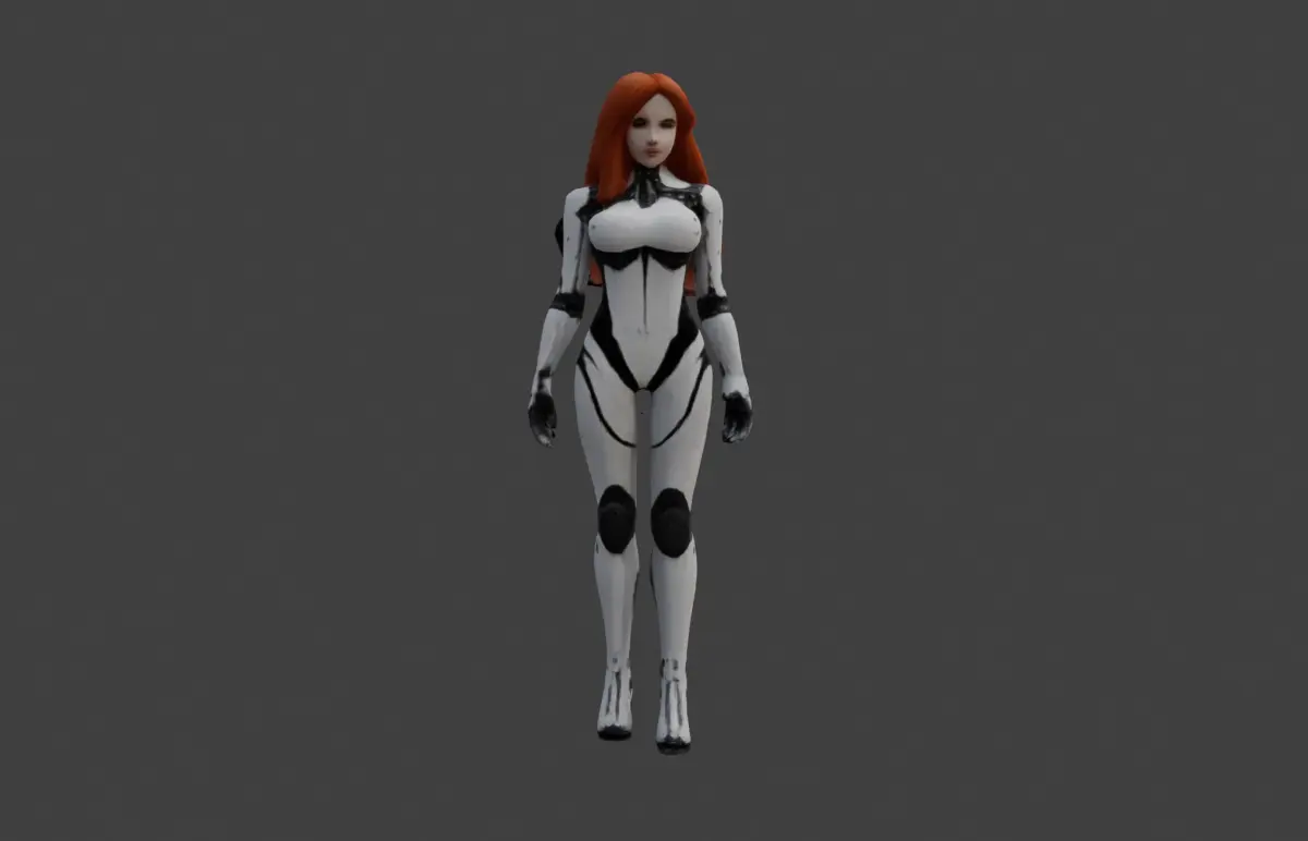 This highly detailed 3D model depicts a futuristic cyborg woman with vibrant red hair, adorned in a sleek, white and black exosuit. The design harmoniously blends human features with mechanical aesthetics, showcasing intricate paneling, polished surfaces, and subtle technological accents. The character exudes a sense of elegance and futuristic sophistication, making it an ideal centerpiece for sci-fi or cyberpunk-themed projects.The model is available for download in gmb format, complete with high-resolution textures that bring out its fine details. From the reflective sheen of the exosuit to the lifelike hair and skin textures, every element has been carefully crafted for realism. The textures are optimized for a variety of rendering environments, ensuring stunning visuals in both close-up and wide-angle views.In addition to the gmb format, the model is also available in FBX format, though it is not rigged or animated. This allows users the flexibility to apply their own rigging or animations based on the needs of their projects. Whether you’re working on static scenes, concept art, or visual design explorations, this character model offers endless creative possibilities.The attention to detail and high-quality textures make this model an excellent choice for professional and personal projects alike. Its futuristic and human-like design makes it perfect for showcasing advanced robotics, cybernetic concepts, or storytelling in a sci-fi setting, ensuring it stands out as a compelling addition to any creative endeavor.