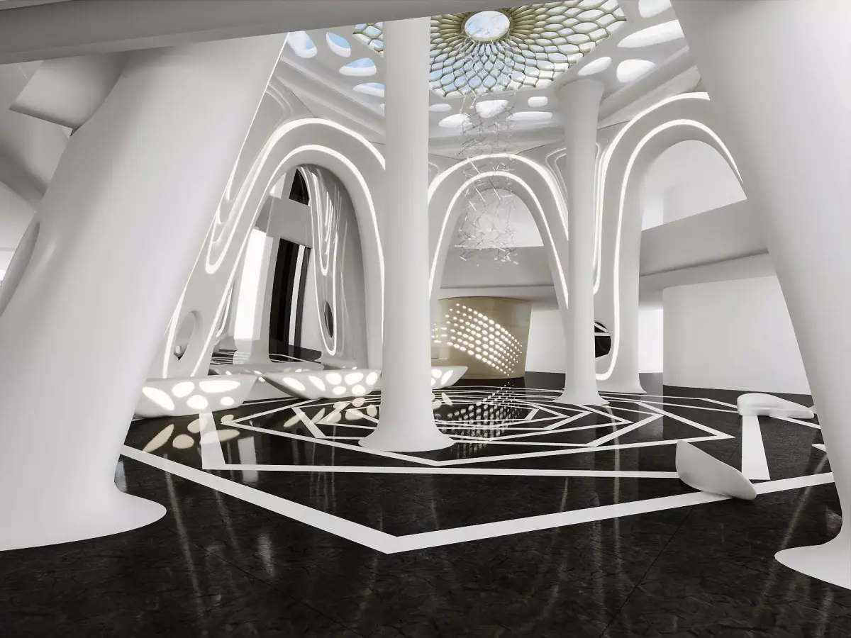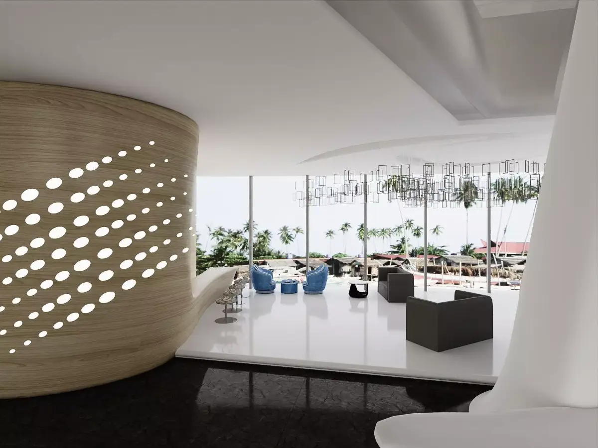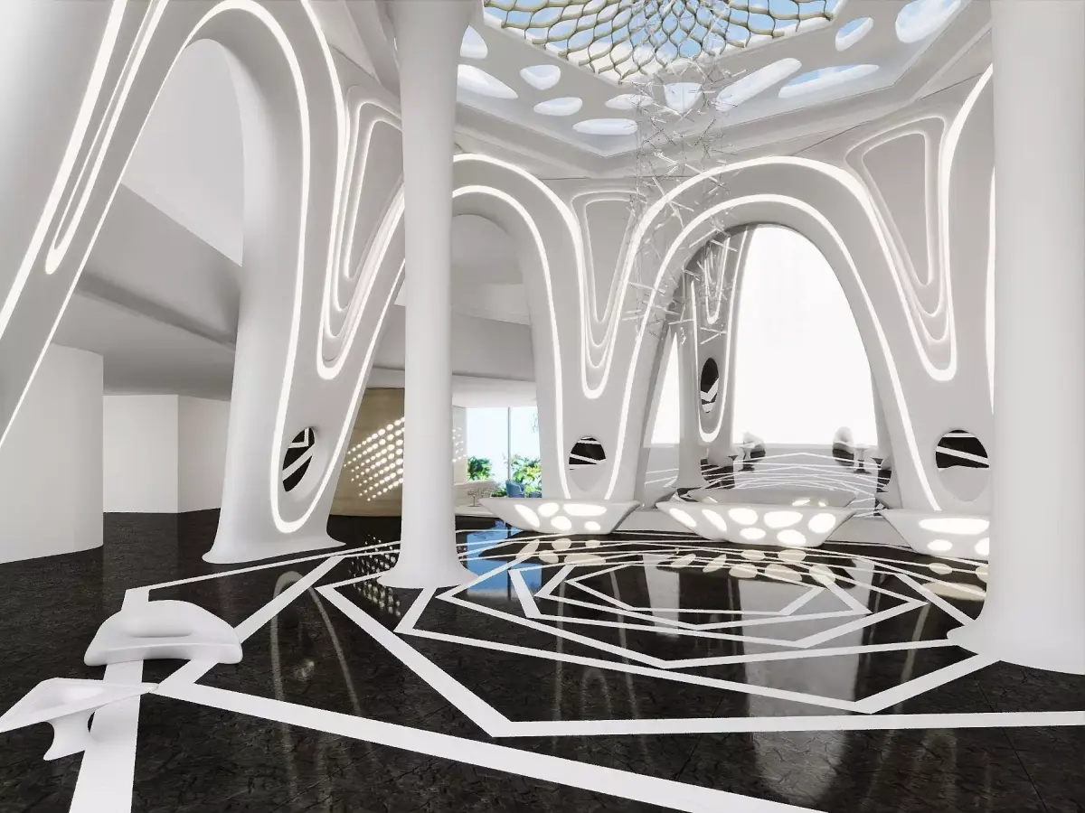 Every detail — from the sculptural ceiling geometry and artistic lighting installation to the high-end blue lounge chairs — has been carefully designed to convey a sense of sophistication and tranquility. The overall atmosphere blends minimalism, light luxury, and futuristic style, creating a perfect environment for resort, hospitality, and architectural visualization projects.
