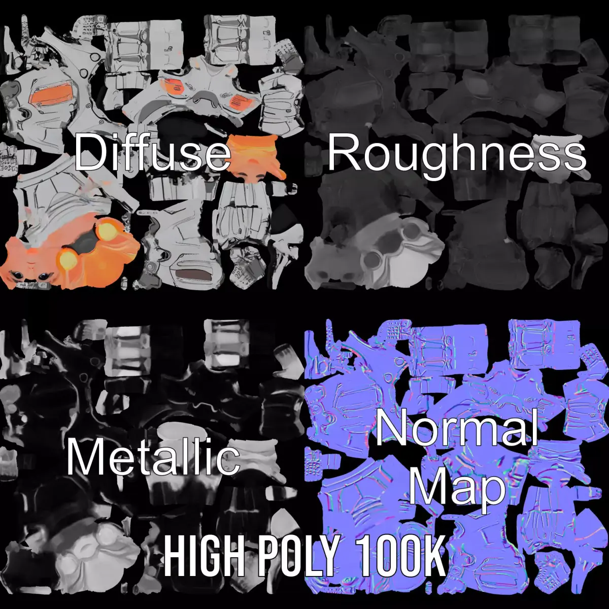 This futuristic silver robot model features a sleek and advanced design, perfect for sci-fi animations and interactive presentations. Each model has 3 levels of detail: low-poly (1000 triangles for mobile), middle-poly (10,000 triangles for environment), and high-poly (100,000 triangles), which allows for the use of this model in production rendering (such as 3ds Max, Maya, Cinema 4D, Blender, Vray/Corona/Cycles and all others), game engines (Unity and Unreal compatible), and interactive presentations, providing a choice of detail based on the LOD system principle. Suitable for use in games, simulations, or as a centerpiece in futuristic visual narratives. The model's textures are PBR, Diffuse, NormalMap, and reflection/roughness/metallic, which are suitable for any modern rendering engine. All models are accurately unwrapped and have no overlapping UV. All textures are 4096*4096 in size. Please like and leave a comment if you enjoyed this model.
